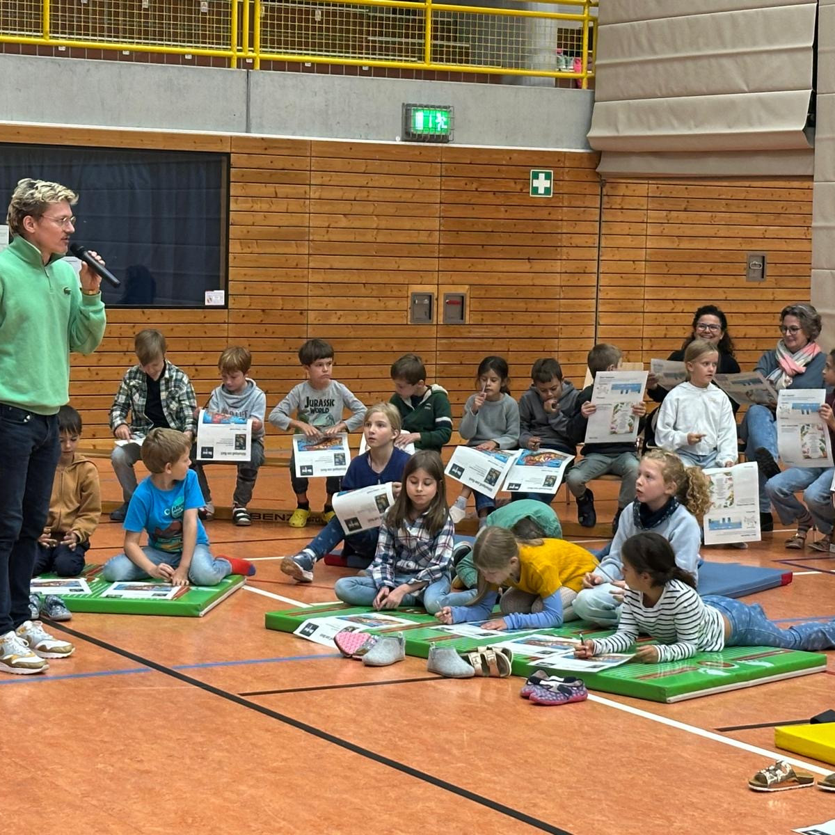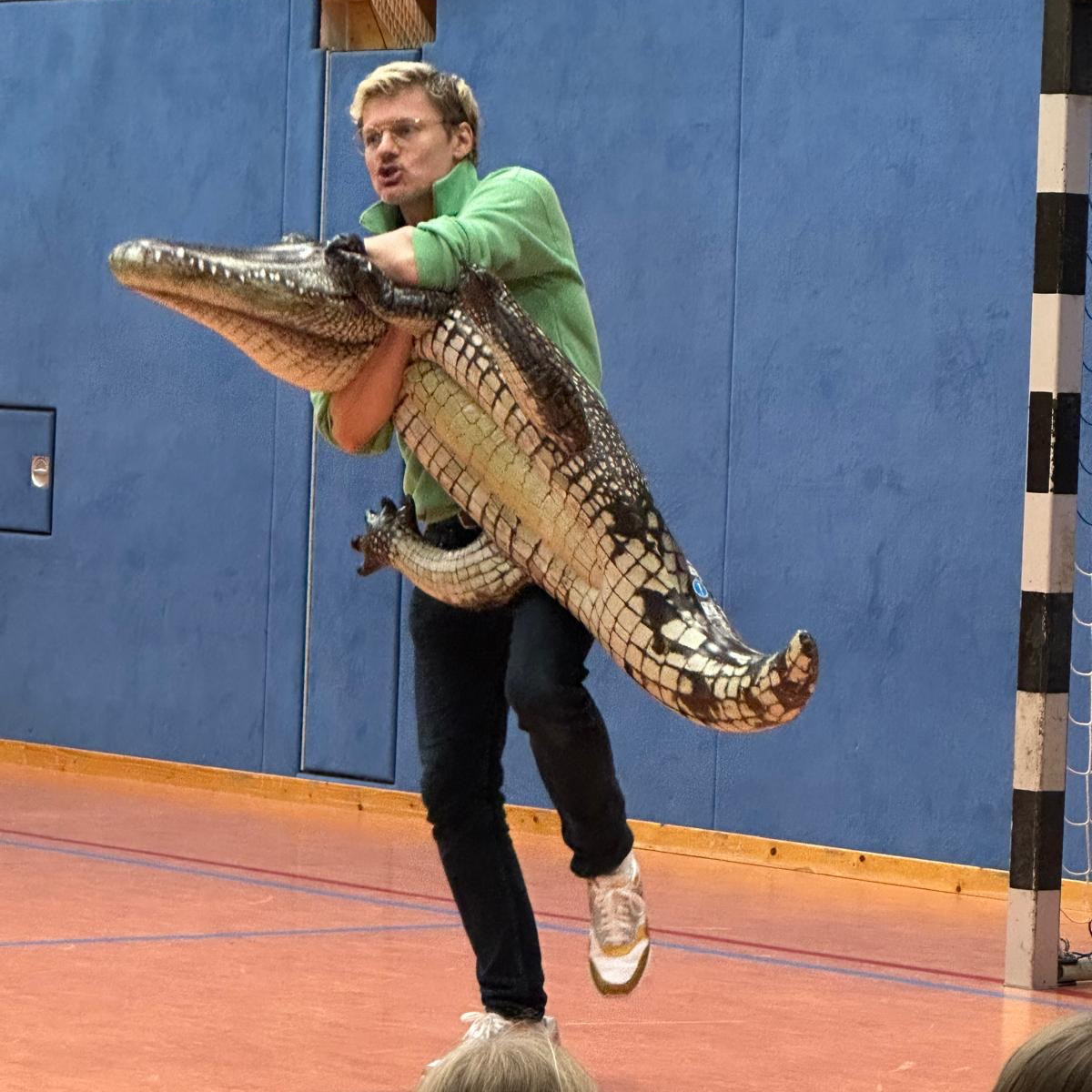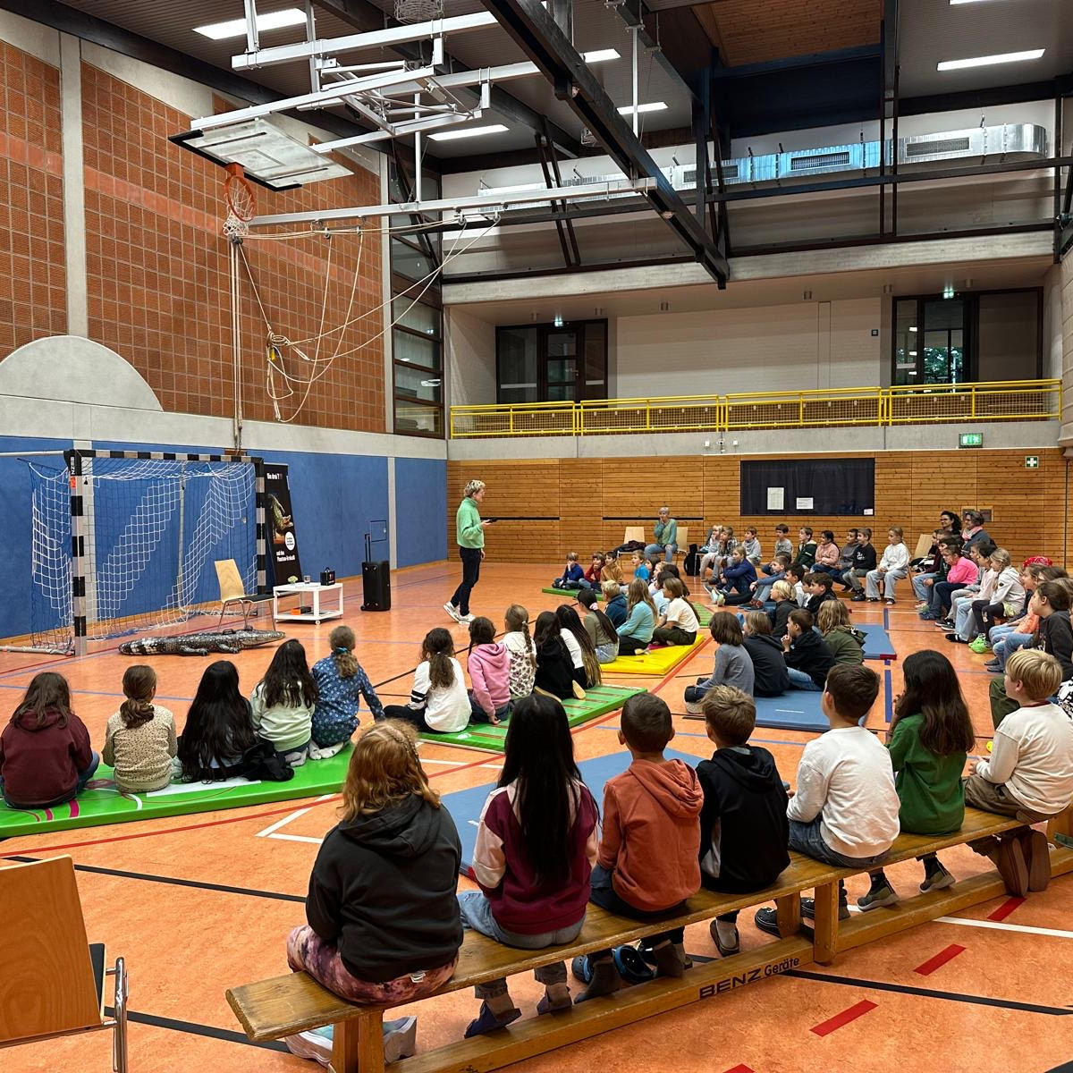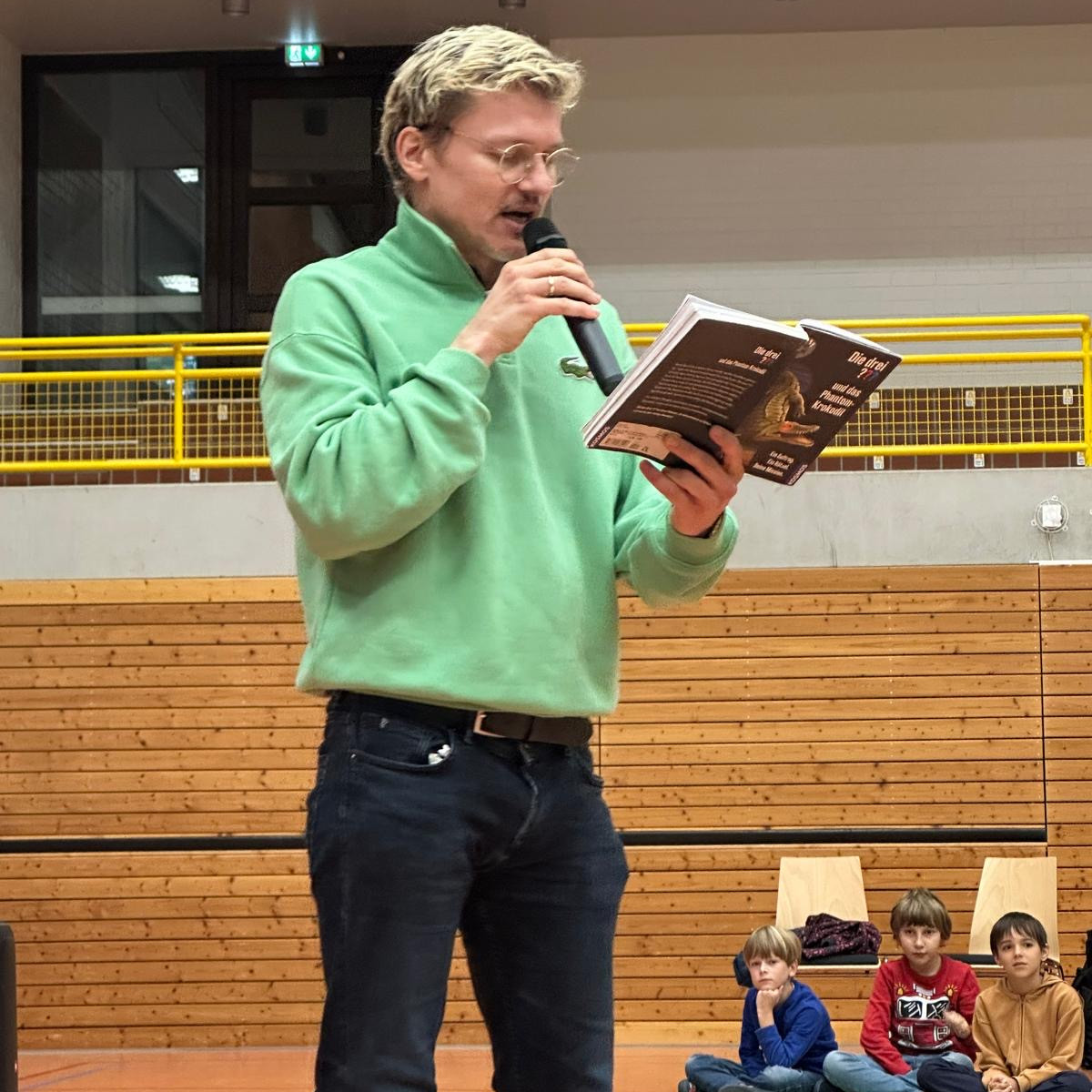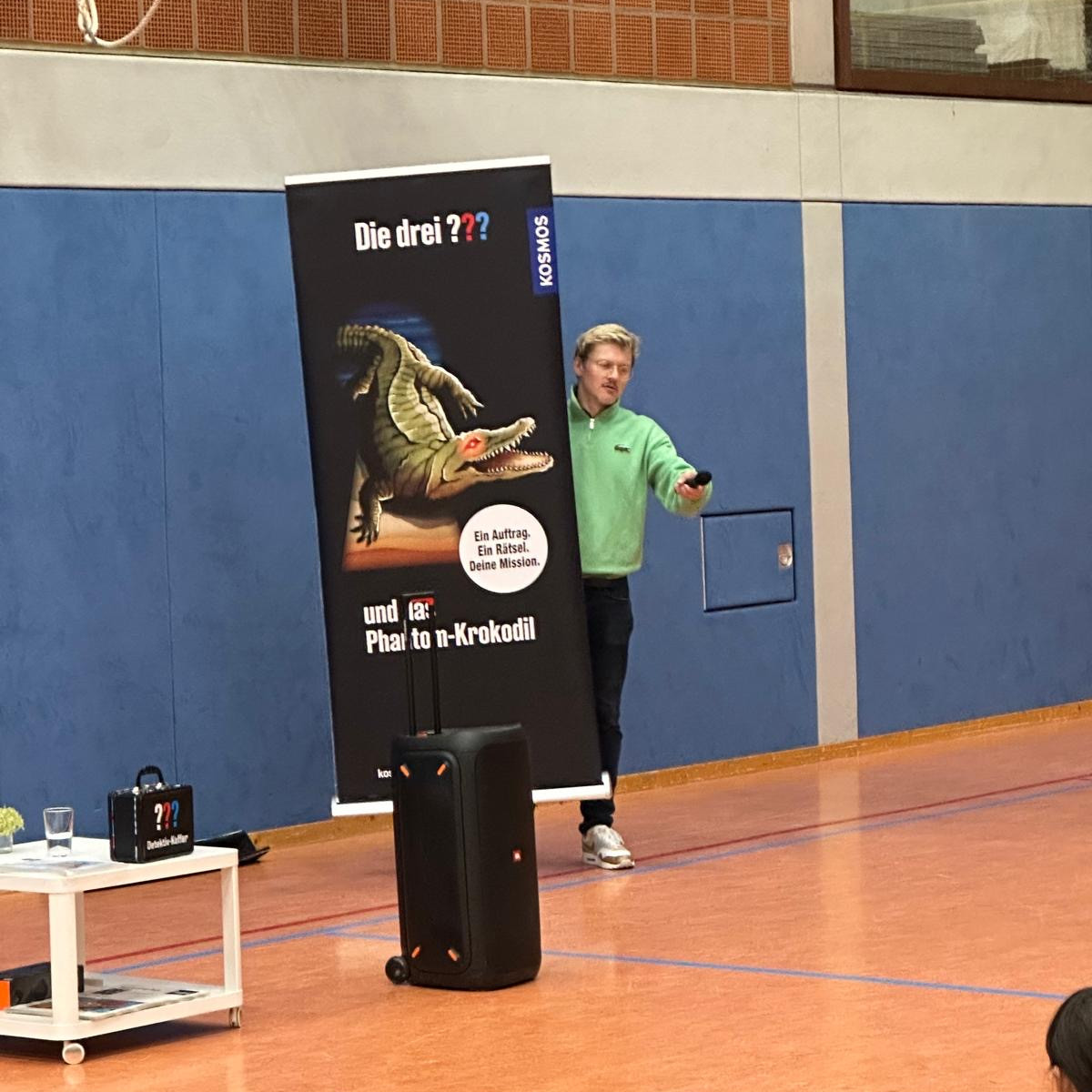 Am 24.09.25 kam der Autor Christian Friedrich für eine Lesung an unsere Schule. In der Turnhalle las er den dritten und vierten Klassen aus dem Buch „Die drei ??? und das Phantomkrokodil" vor. Er begann mit einer spannenden Textstelle, in der es um eine Möve ging. Seine Lesung war sehr lebendig und lustig. Er hatte sogar ein aufblasbares Krokodil dabei. Am besten fanden wir sein „Anti-Krokodil-Konfu“.