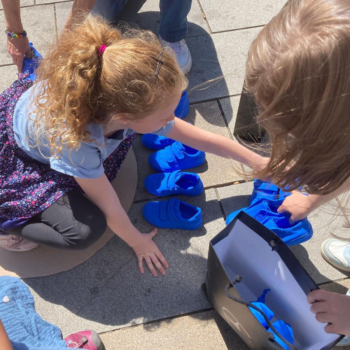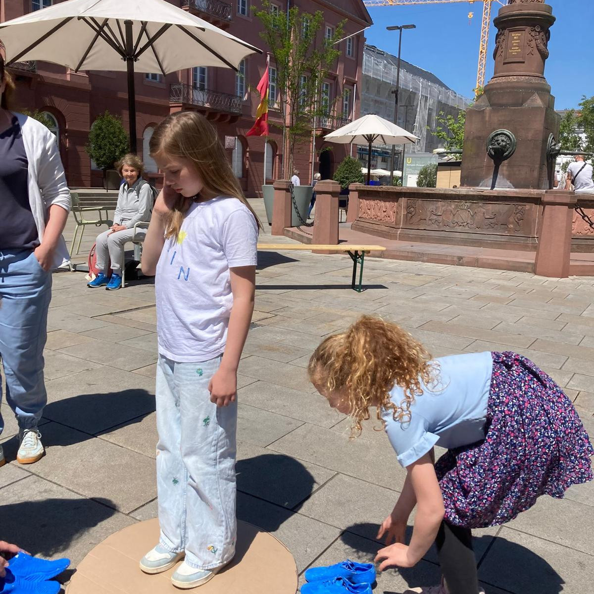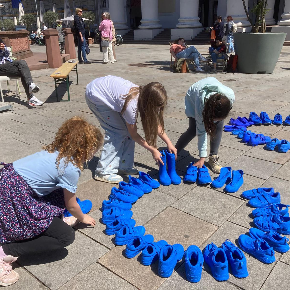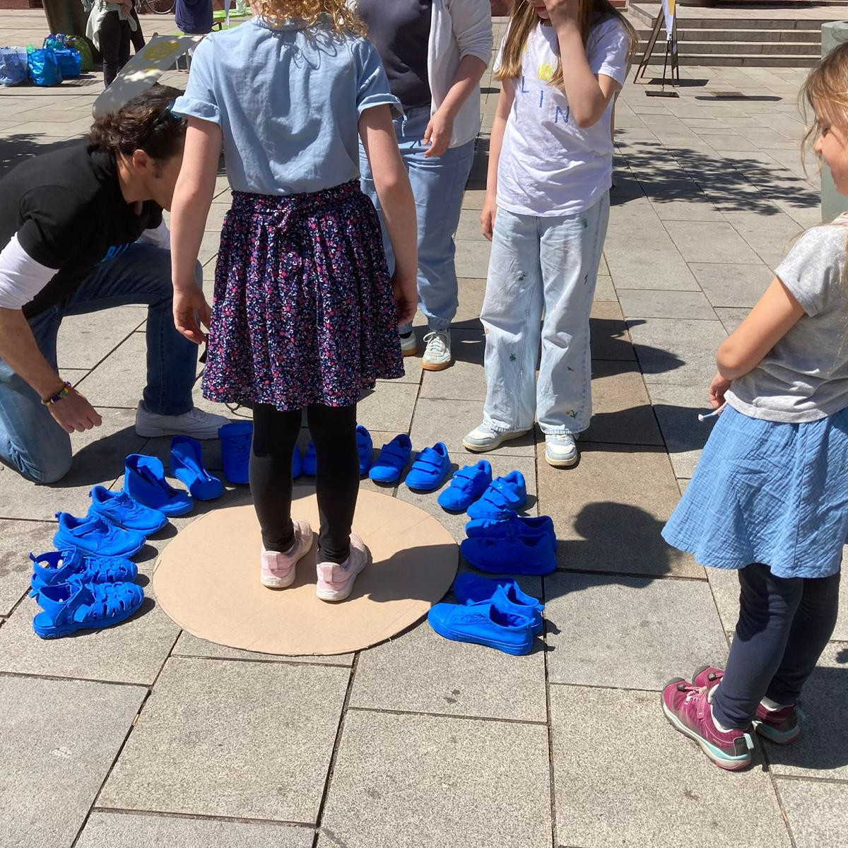 Die SchülerInnen der beiden dritten Klassen unserer Schule haben an der Vorbereitung und Durchführung der Installation mit großer Begeisterung teilgenommen. So wurden insgesamt 18 Paar Schuhe grundiert und blau eingefärbt. Auch beim Aufbau der Installation auf dem Marktplatz durften Kinder unsrere Schule den Künstler unterstützen.