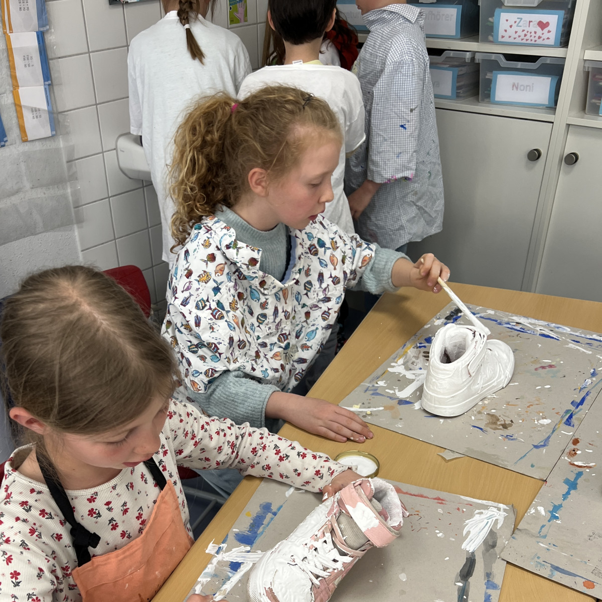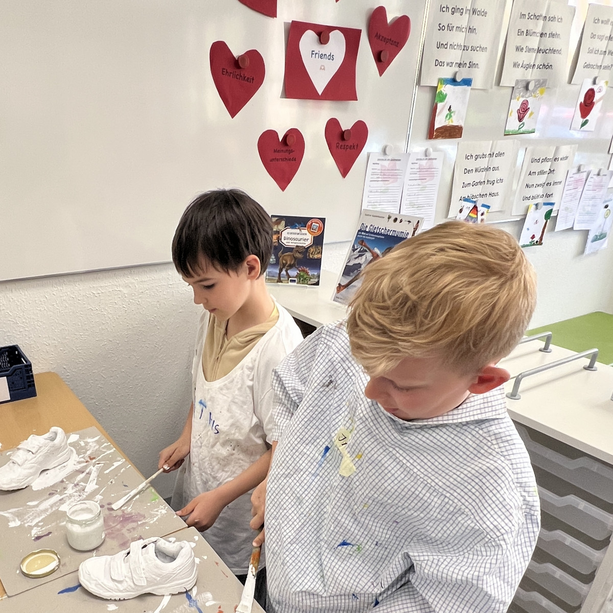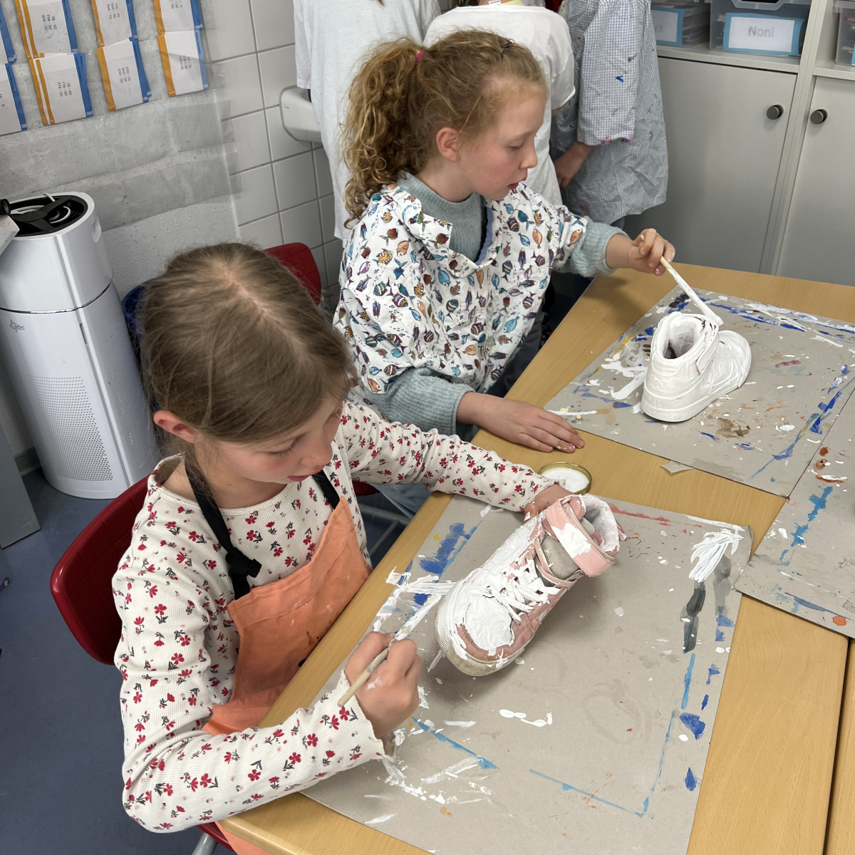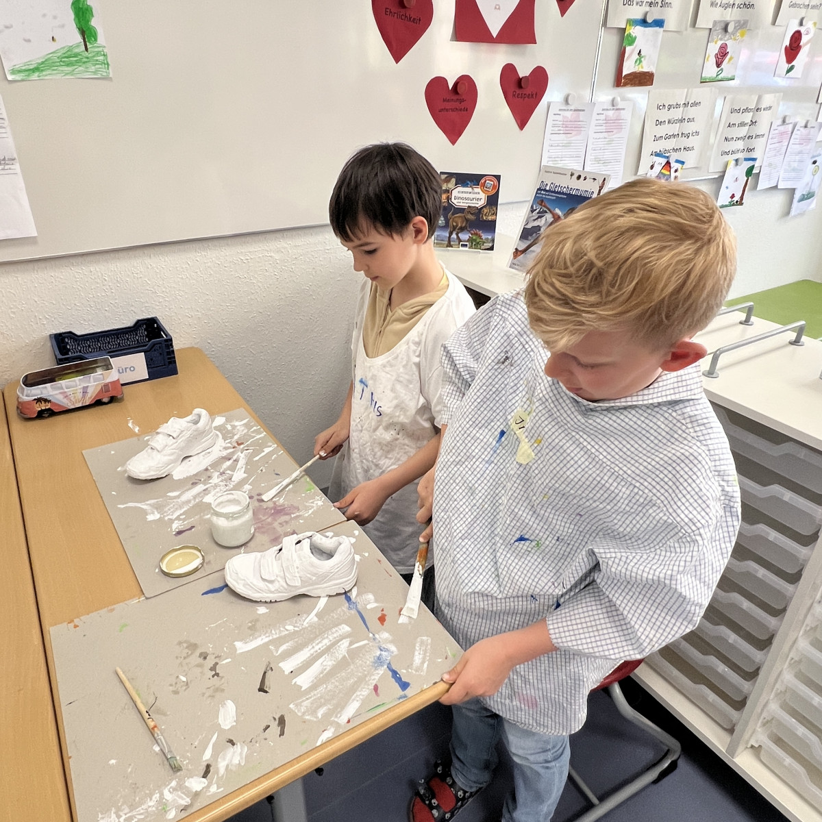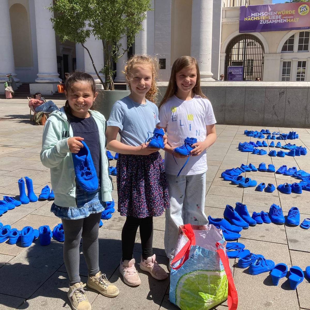 Die SchülerInnen der beiden dritten Klassen unserer Schule haben an der Vorbereitung und Durchführung der Installation mit großer Begeisterung teilgenommen. So wurden insgesamt 18 Paar Schuhe grundiert und blau eingefärbt. Auch beim Aufbau der Installation auf dem Marktplatz durften Kinder unsrere Schule den Künstler unterstützen.