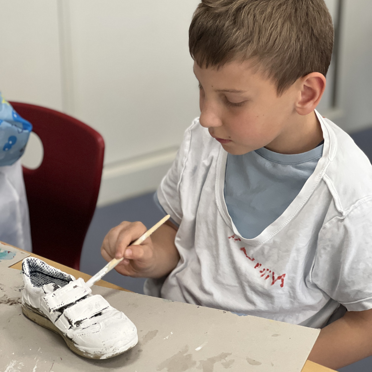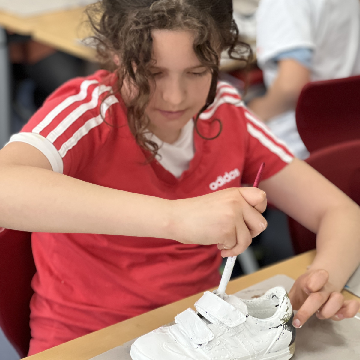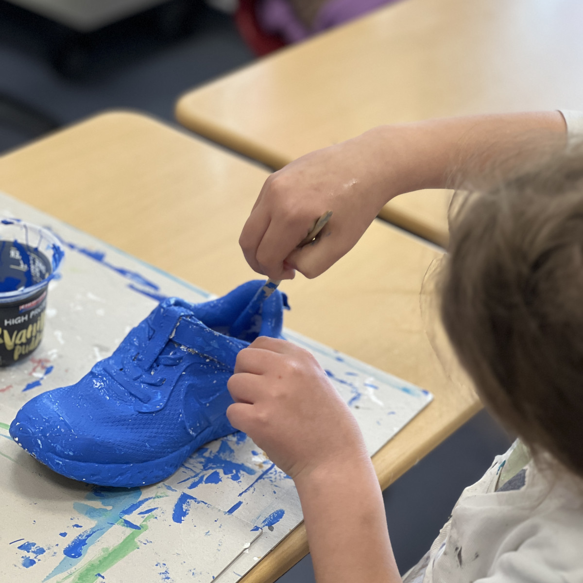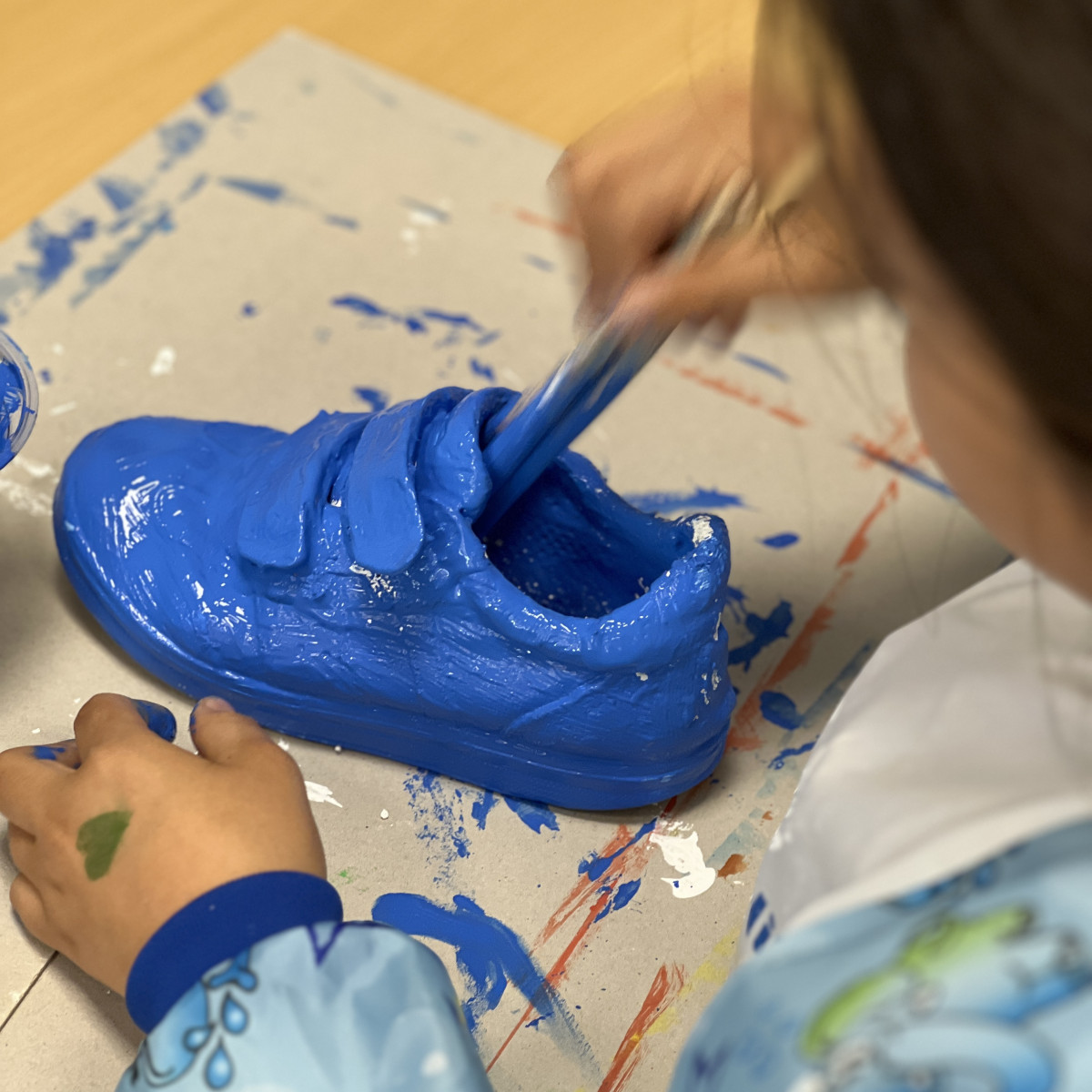 Die SchülerInnen der beiden dritten Klassen unserer Schule haben an der Vorbereitung und Durchführung der Installation mit großer Begeisterung teilgenommen. So wurden insgesamt 18 Paar Schuhe grundiert und blau eingefärbt. Auch beim Aufbau der Installation auf dem Marktplatz durften Kinder unsrere Schule den Künstler unterstützen.