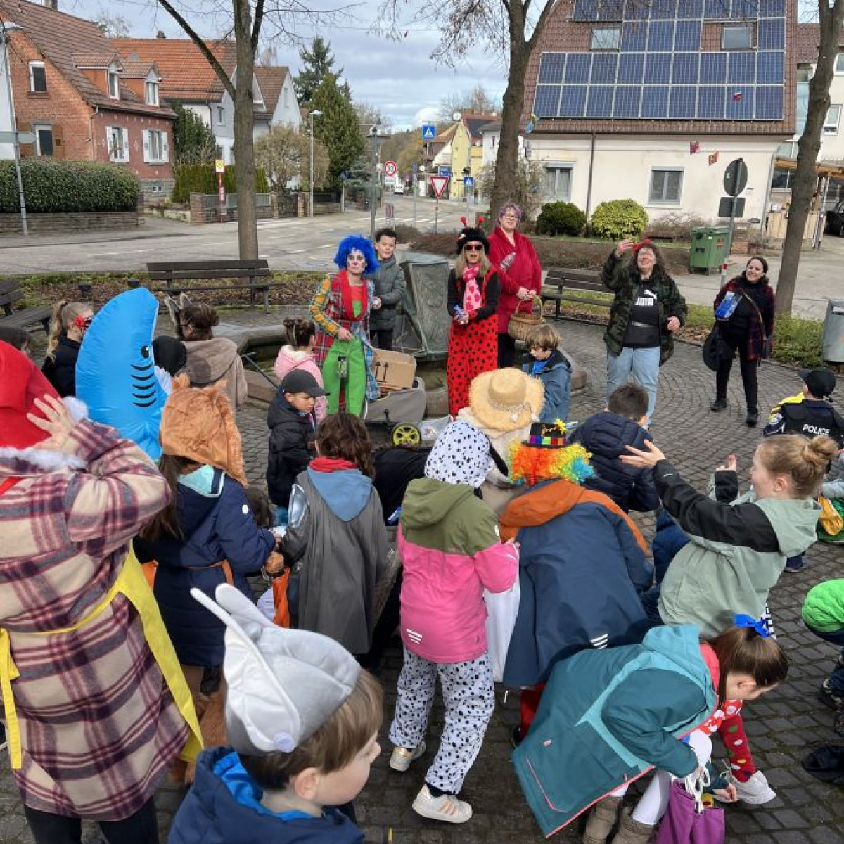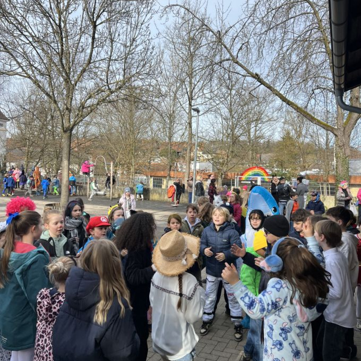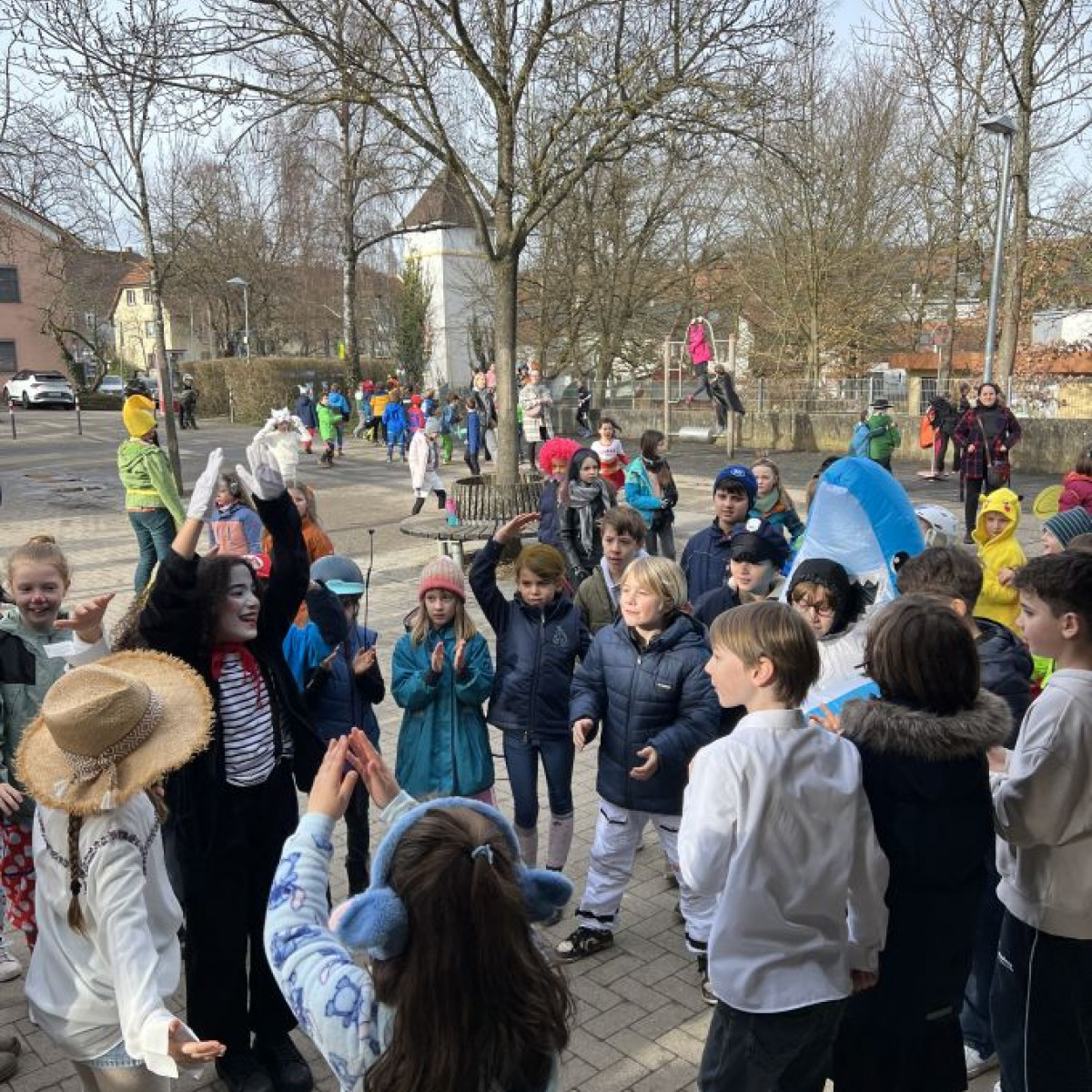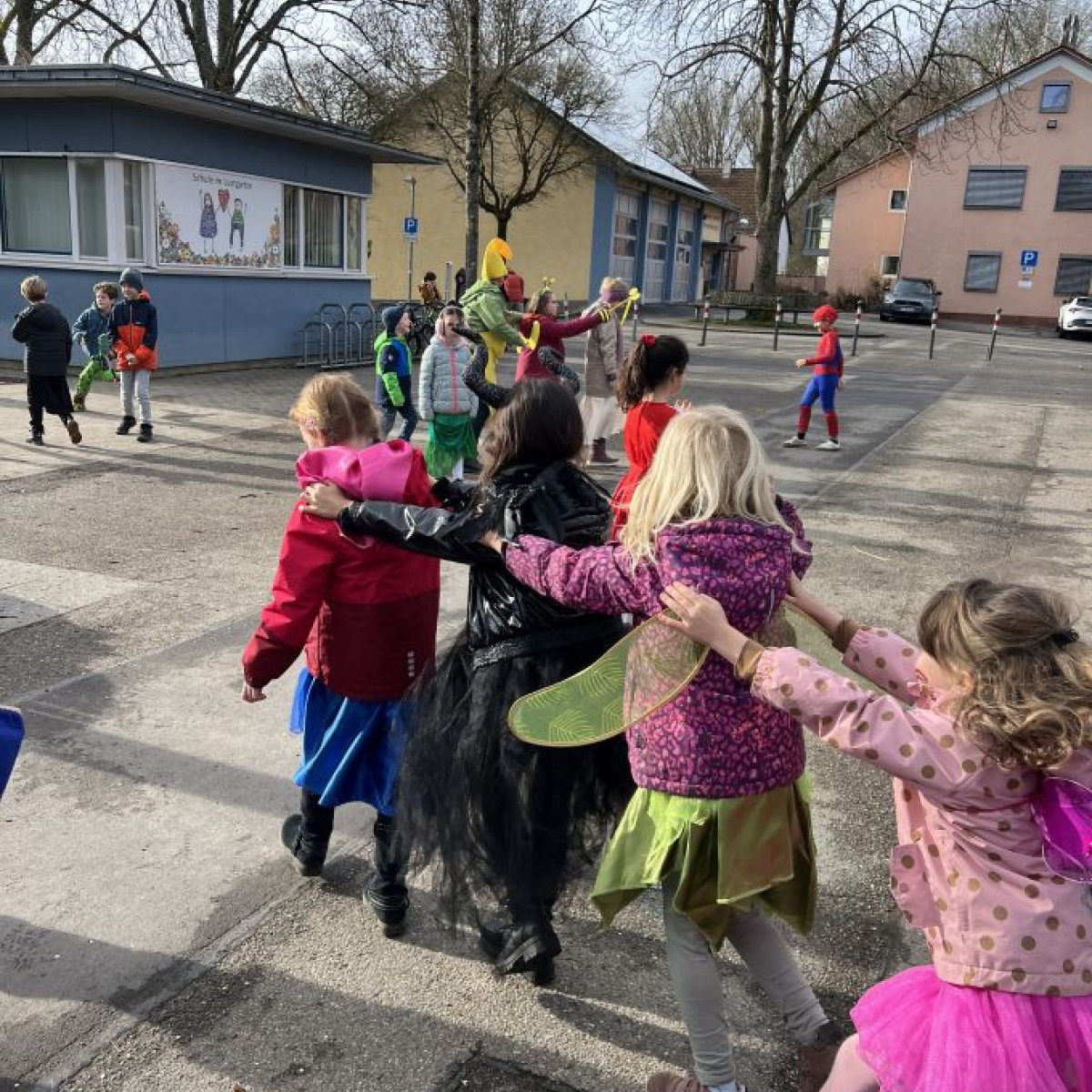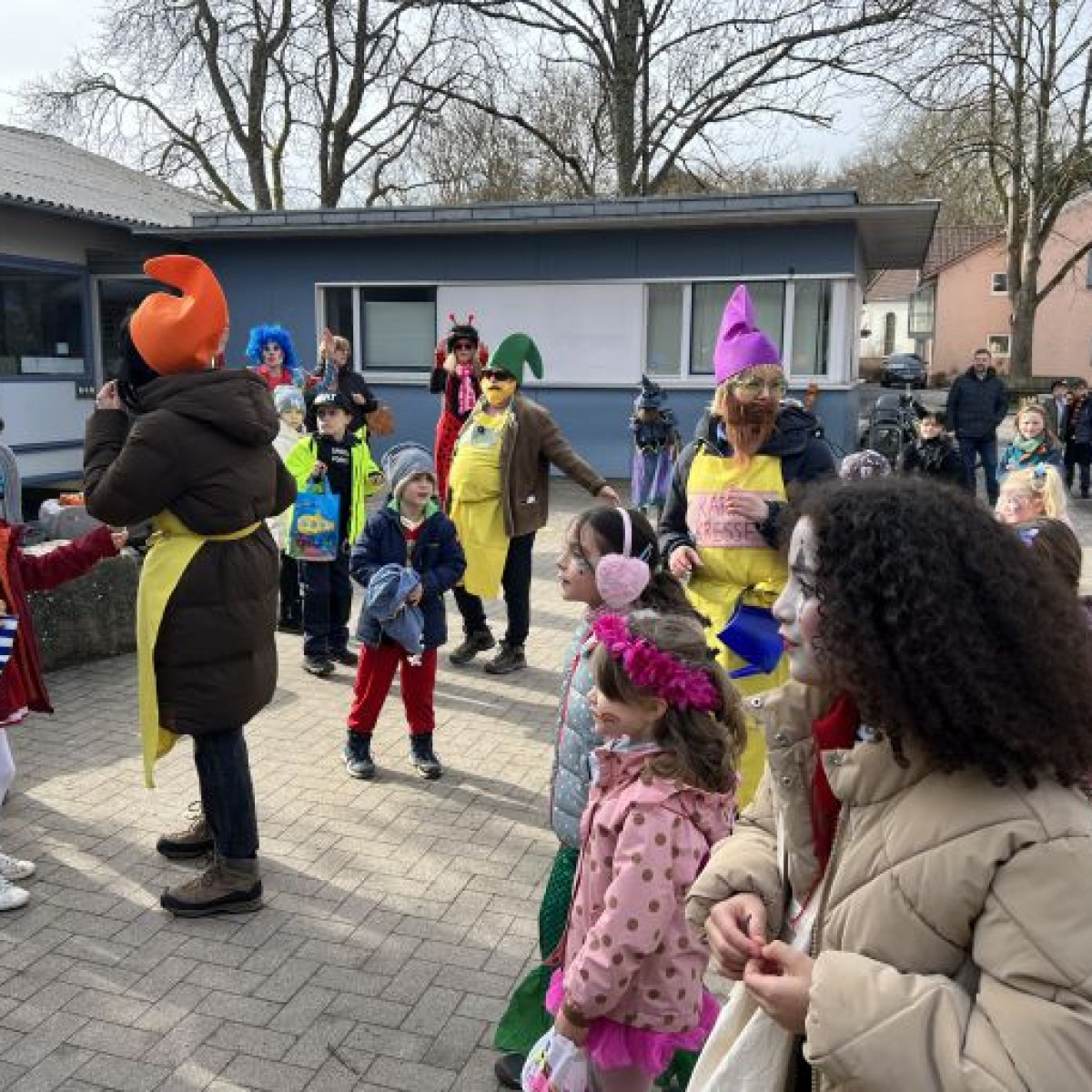 Alle Schülerinnen und Schüler feierten gemeinsam mit ihren Lehrerinnen in den Klassenräumen, bevor eine lange "Gute Laune"- Polonaise durch das Schulhaus zog. In der großen Pause wuchs die Vorfreude spürbar – und dann war es endlich so weit: Die Narren eroberten das Rathaus und der Fastnachtsumzug setzte sich in Bewegung.