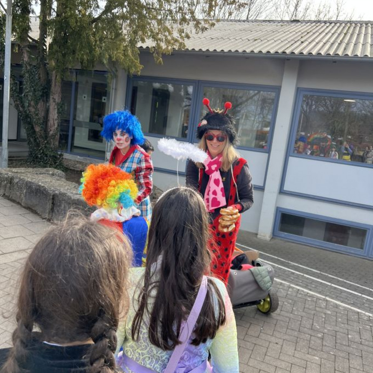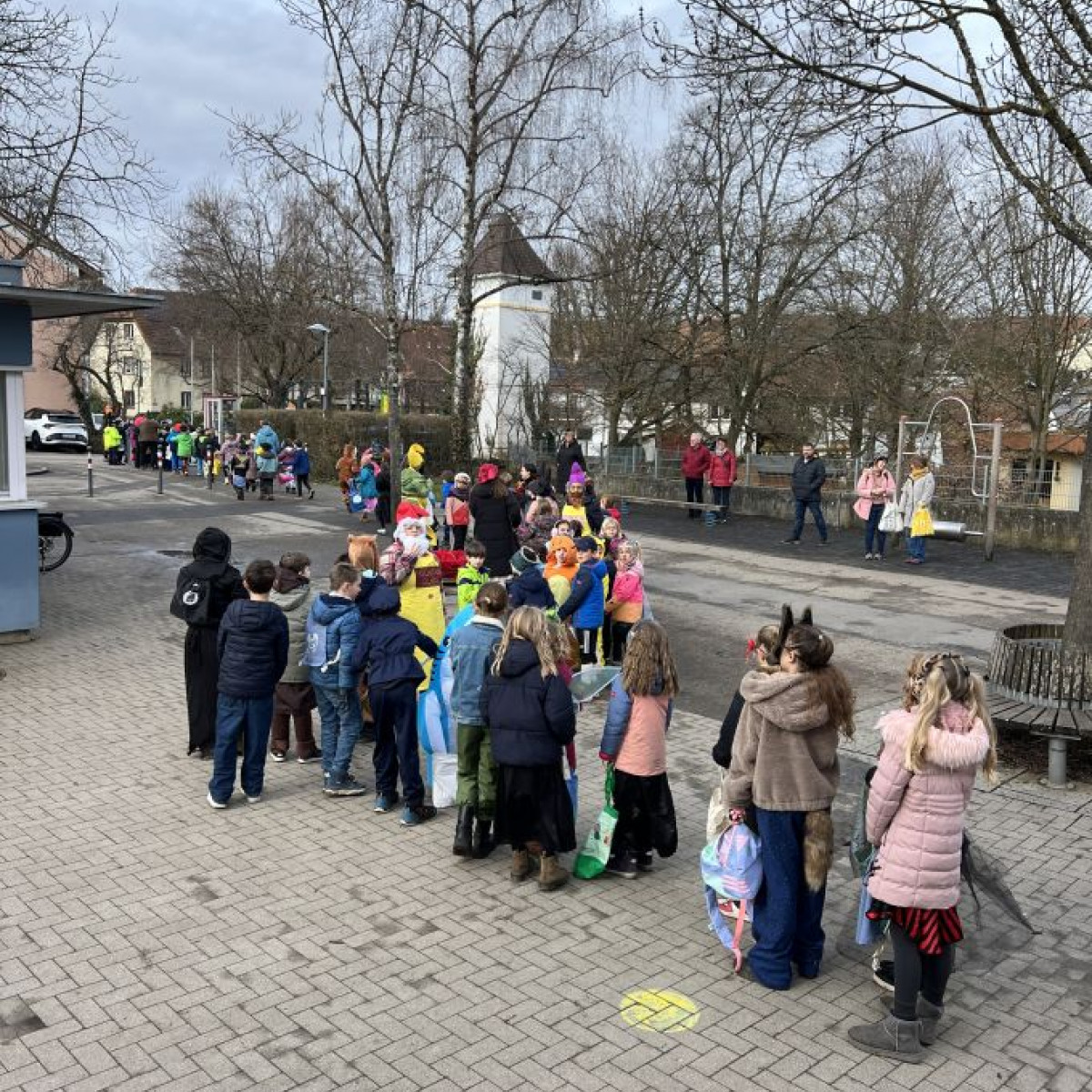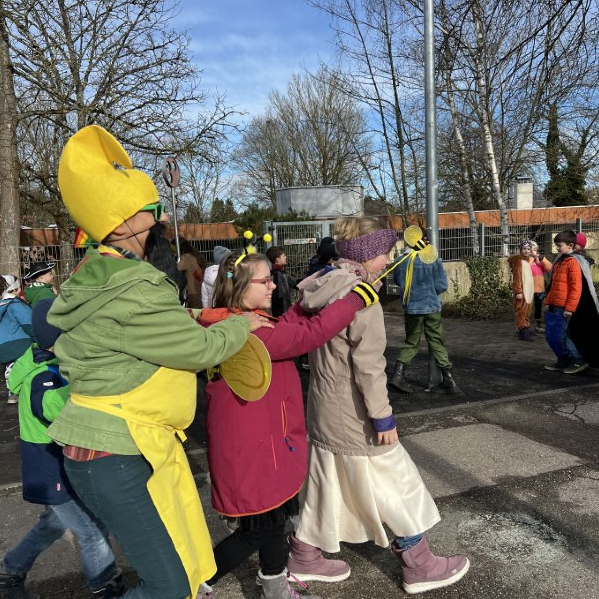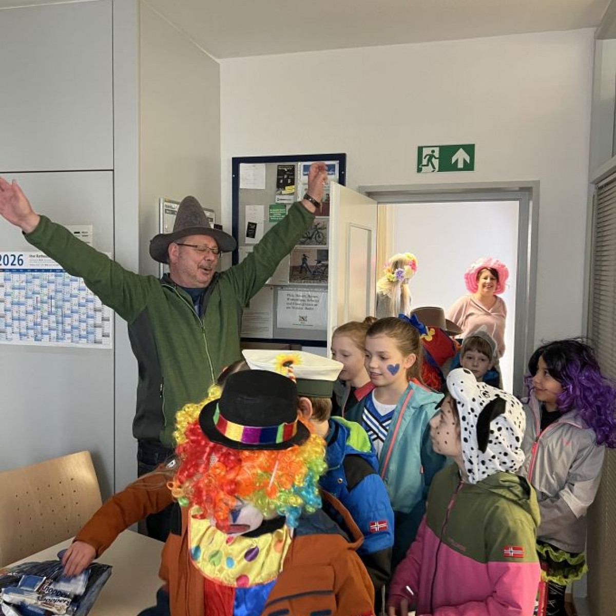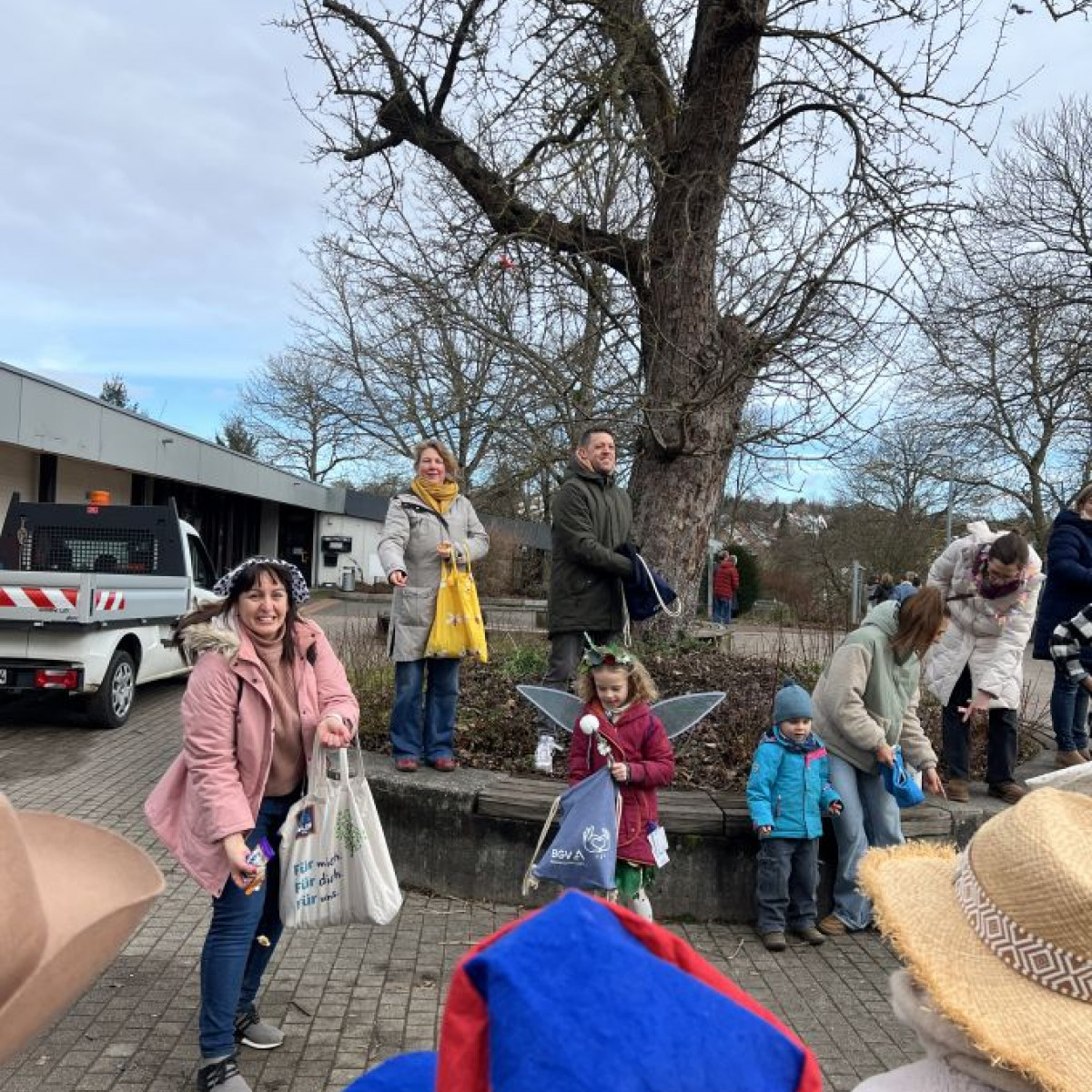 Alle Schülerinnen und Schüler feierten gemeinsam mit ihren Lehrerinnen in den Klassenräumen, bevor eine lange "Gute Laune"- Polonaise durch das Schulhaus zog. In der großen Pause wuchs die Vorfreude spürbar – und dann war es endlich so weit: Die Narren eroberten das Rathaus und der Fastnachtsumzug setzte sich in Bewegung.