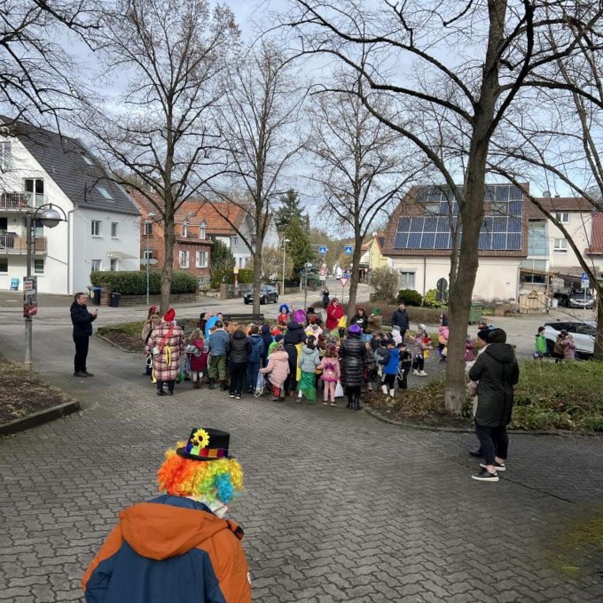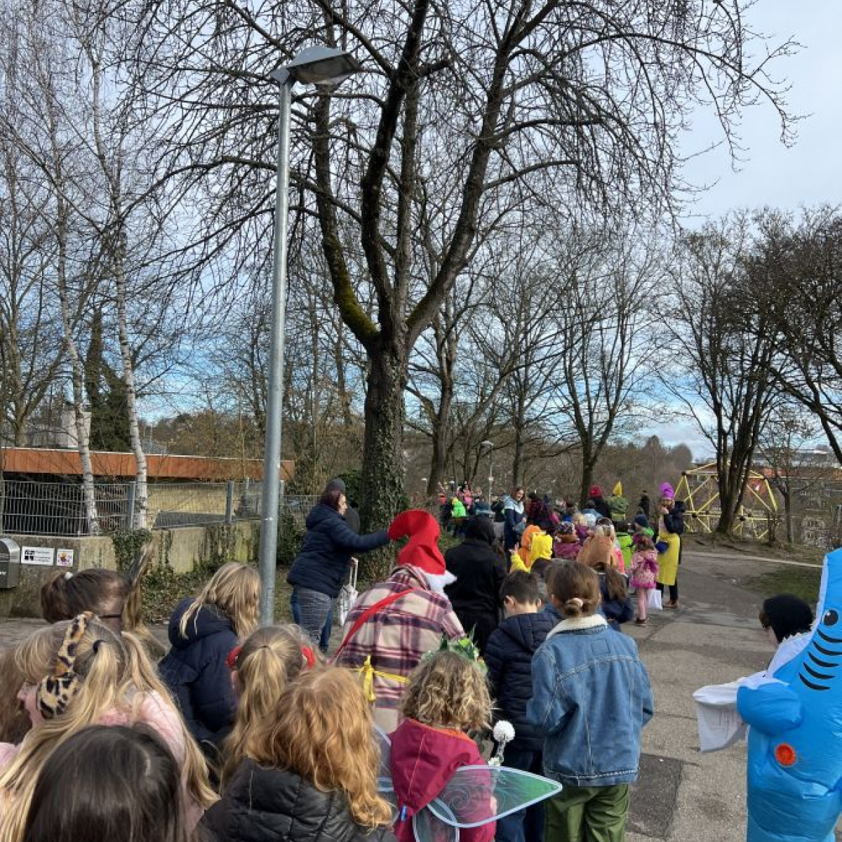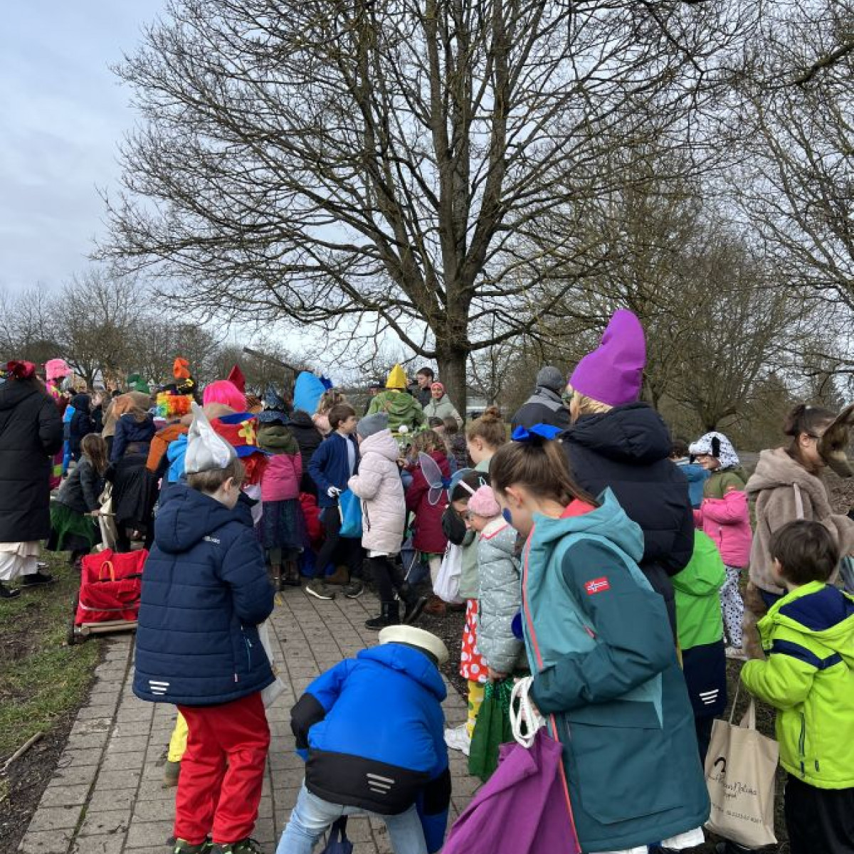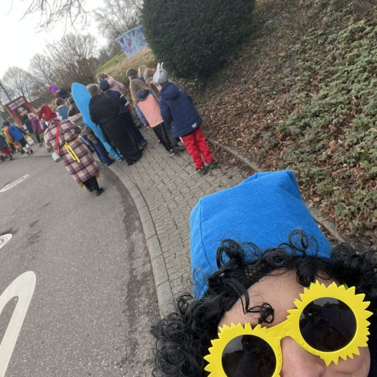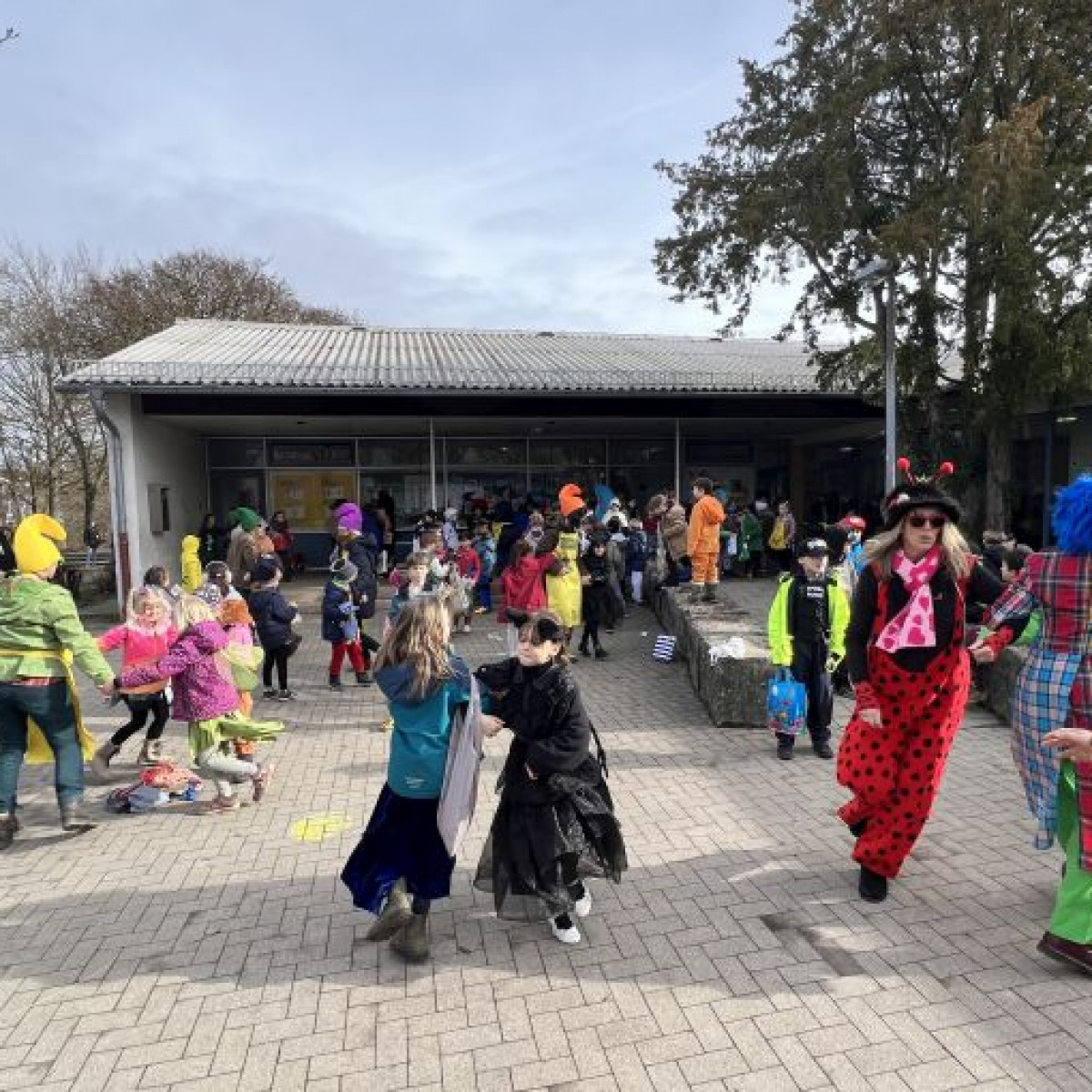 Alle Schülerinnen und Schüler feierten gemeinsam mit ihren Lehrerinnen in den Klassenräumen, bevor eine lange "Gute Laune"- Polonaise durch das Schulhaus zog. In der großen Pause wuchs die Vorfreude spürbar – und dann war es endlich so weit: Die Narren eroberten das Rathaus und der Fastnachtsumzug setzte sich in Bewegung.