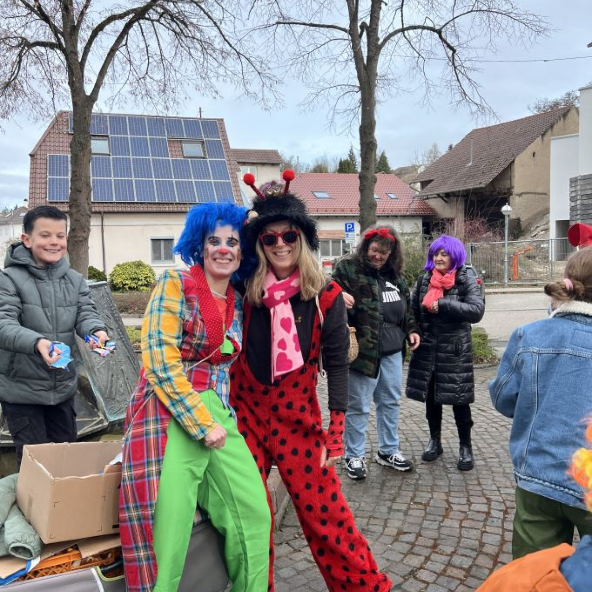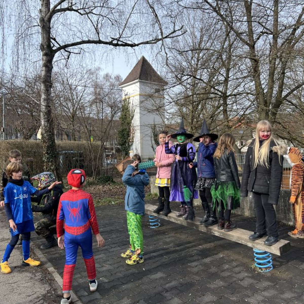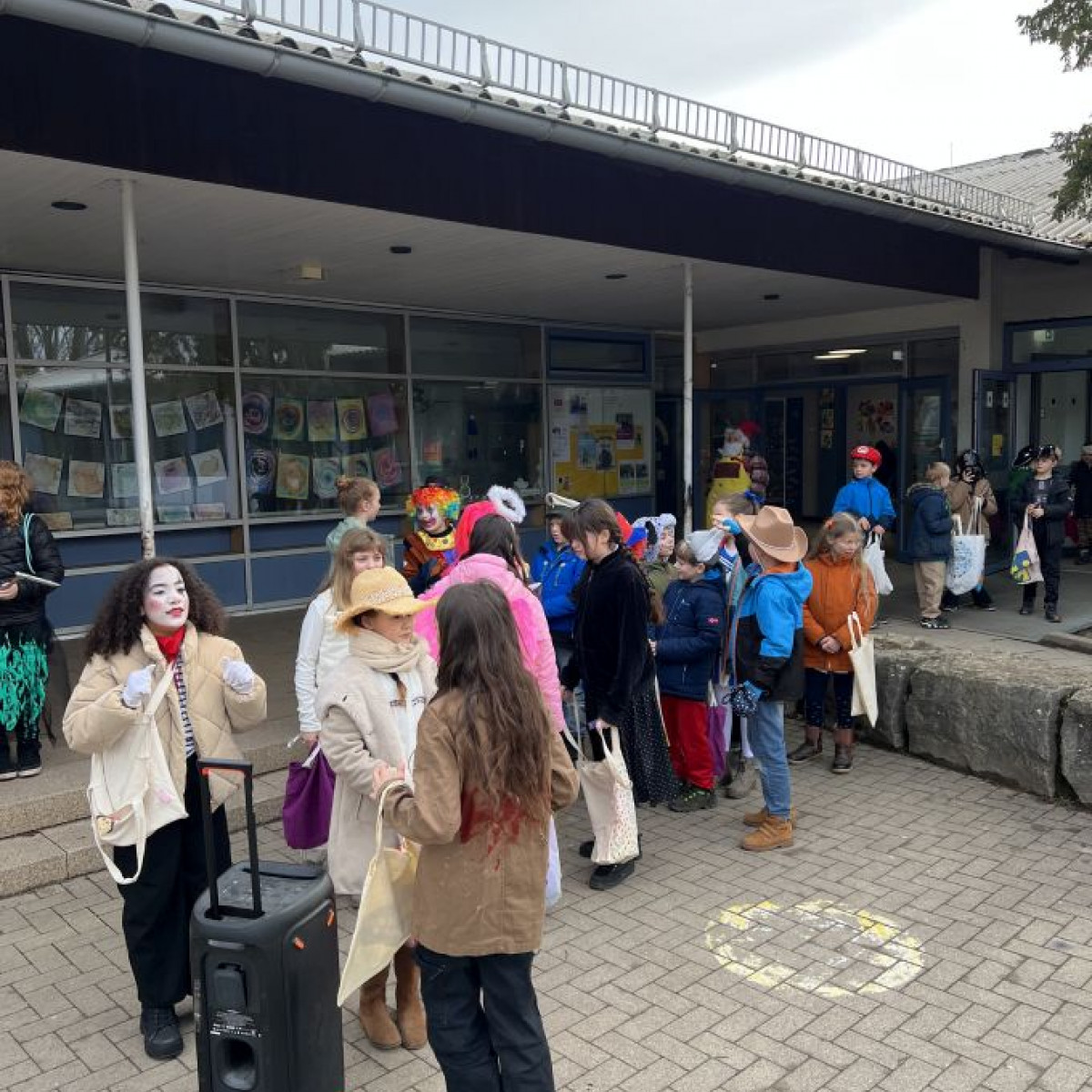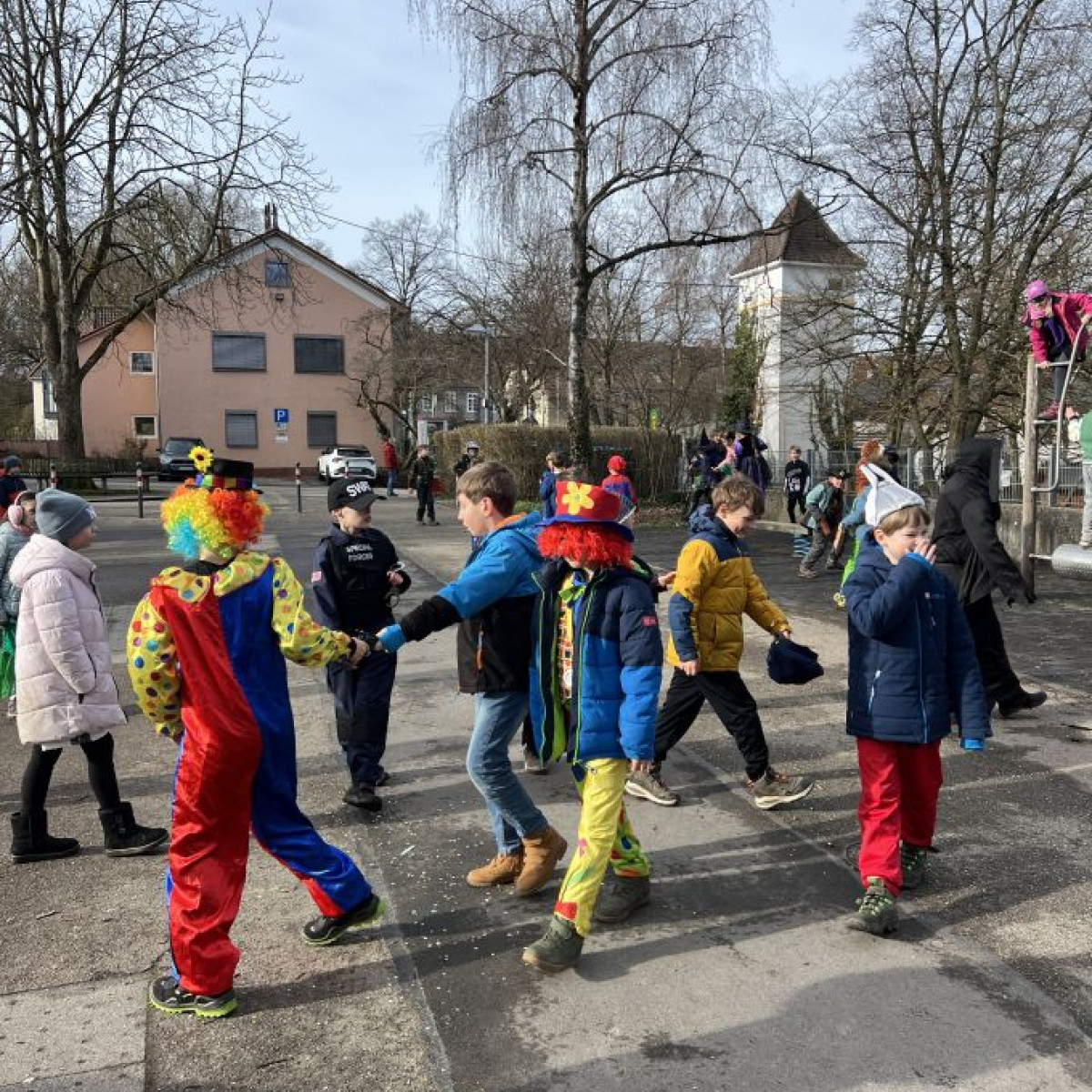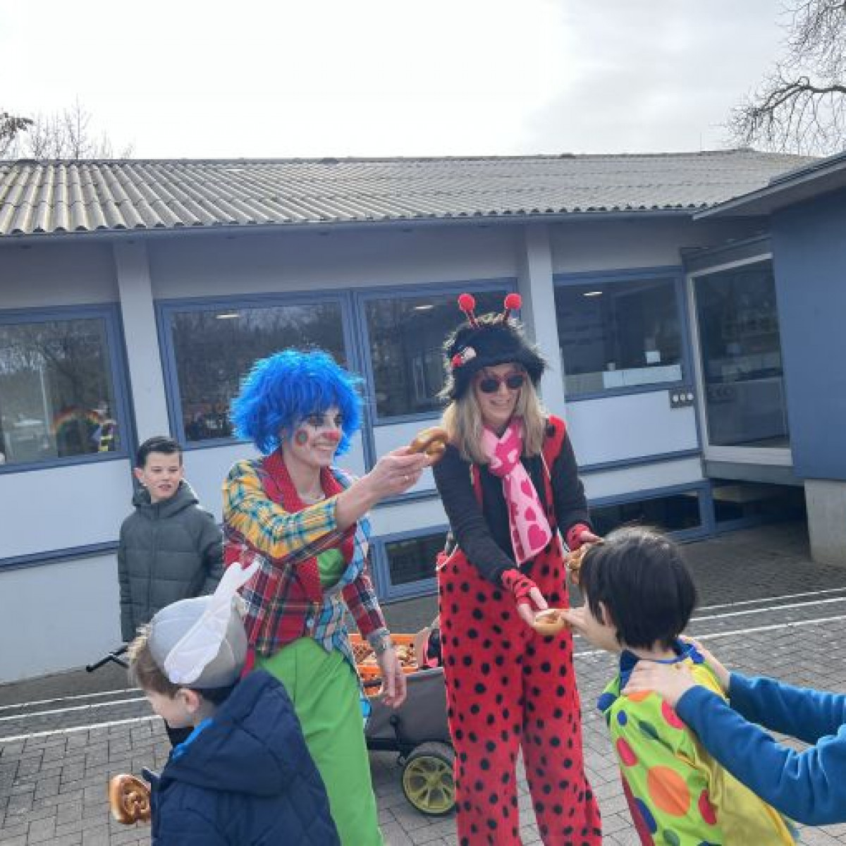 Alle Schülerinnen und Schüler feierten gemeinsam mit ihren Lehrerinnen in den Klassenräumen, bevor eine lange "Gute Laune"- Polonaise durch das Schulhaus zog. In der großen Pause wuchs die Vorfreude spürbar – und dann war es endlich so weit: Die Narren eroberten das Rathaus und der Fastnachtsumzug setzte sich in Bewegung.