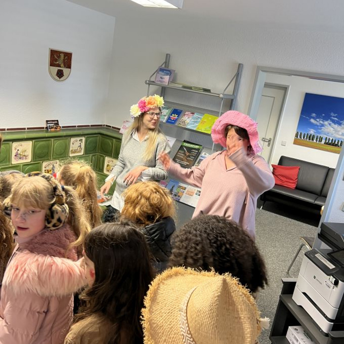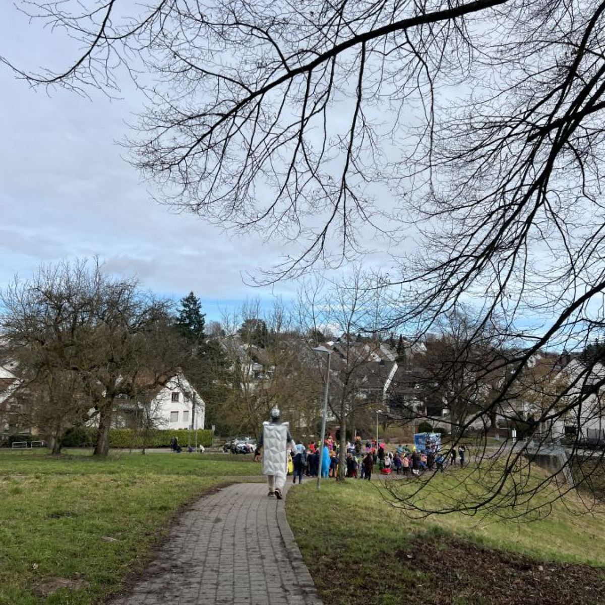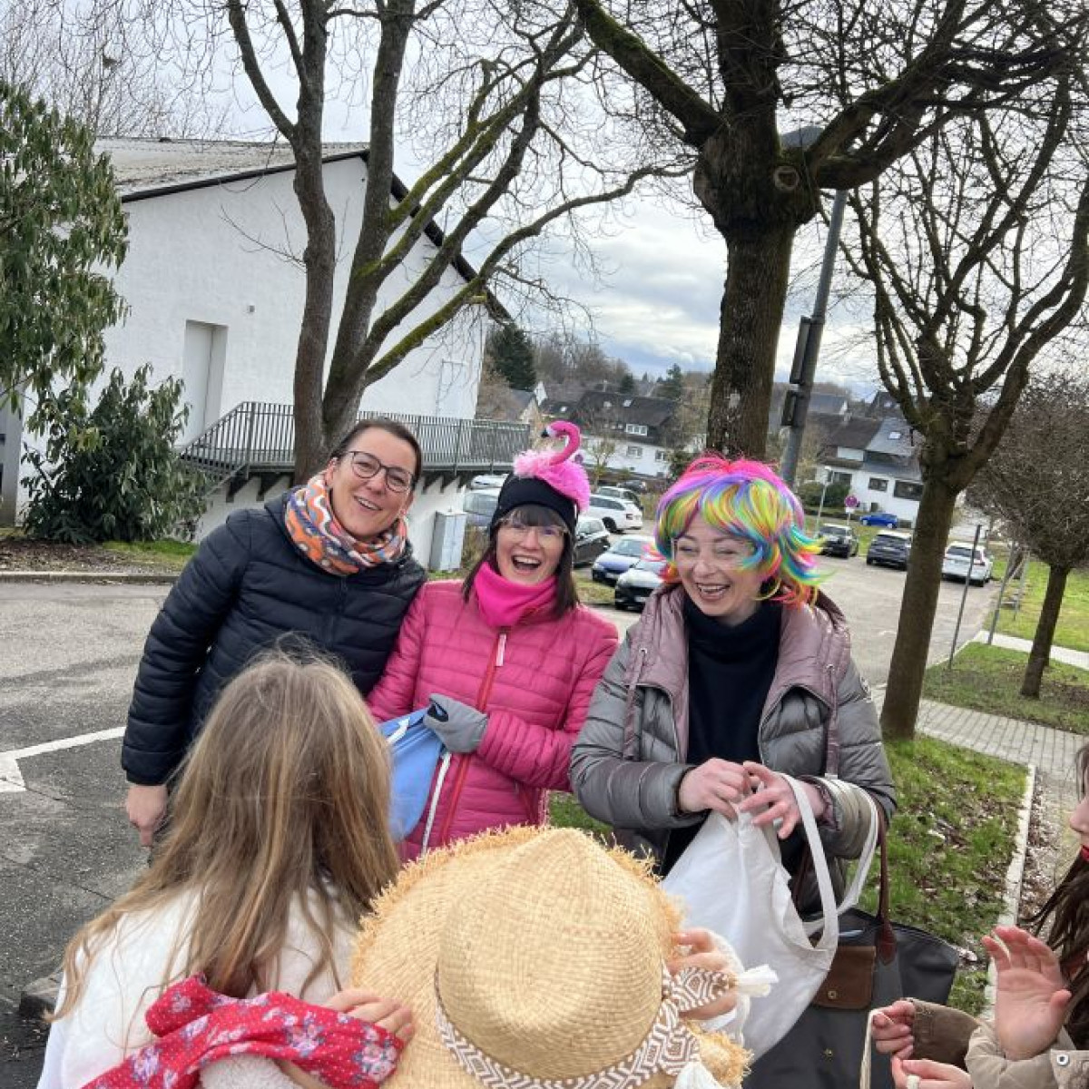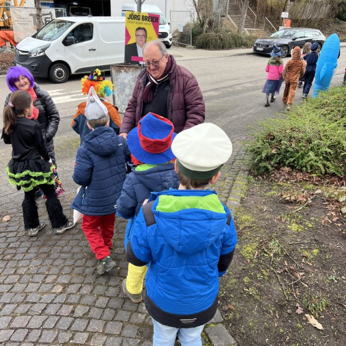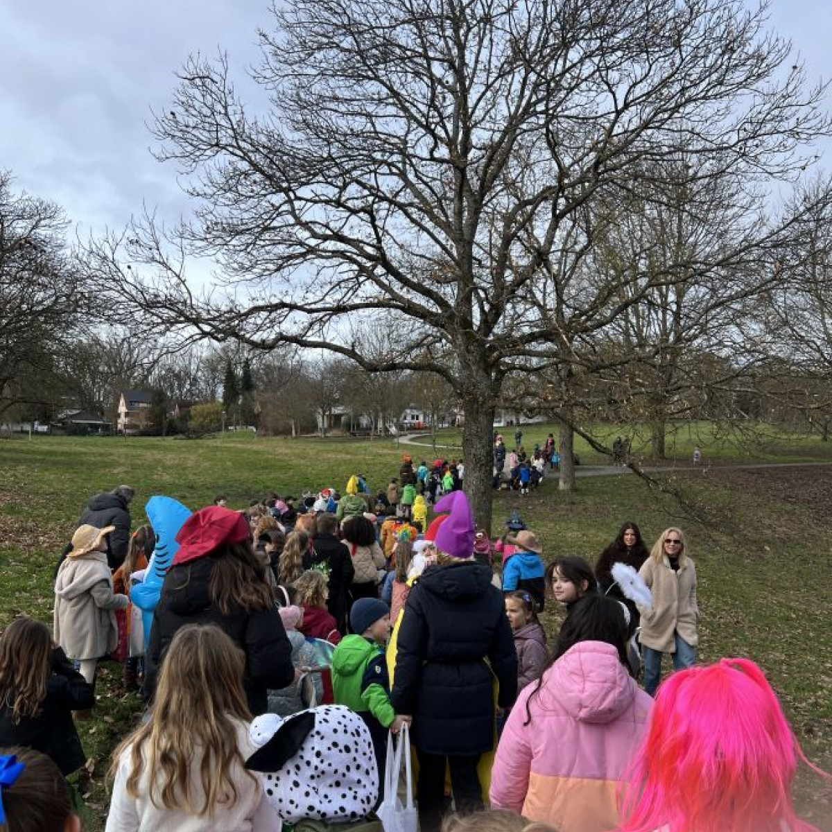 Alle Schülerinnen und Schüler feierten gemeinsam mit ihren Lehrerinnen in den Klassenräumen, bevor eine lange "Gute Laune"- Polonaise durch das Schulhaus zog. In der großen Pause wuchs die Vorfreude spürbar – und dann war es endlich so weit: Die Narren eroberten das Rathaus und der Fastnachtsumzug setzte sich in Bewegung.