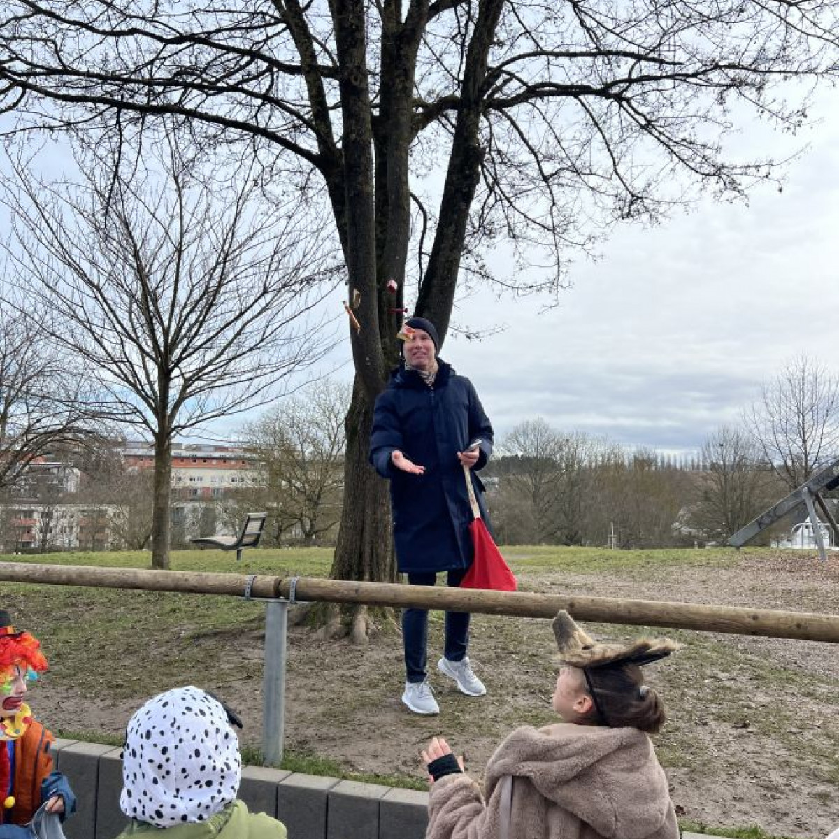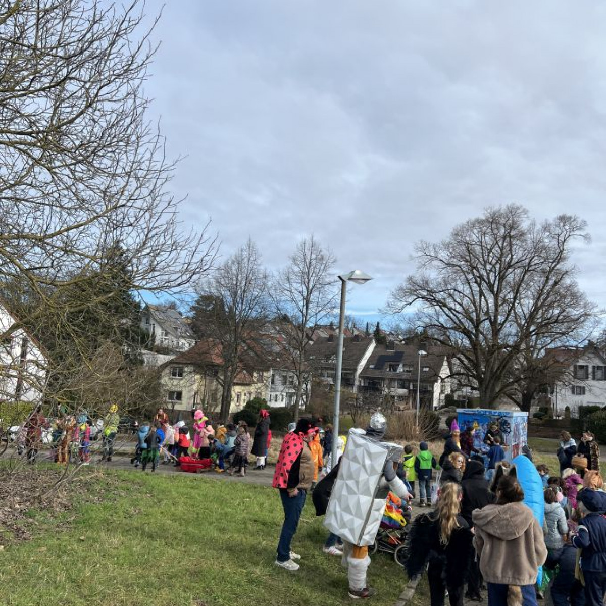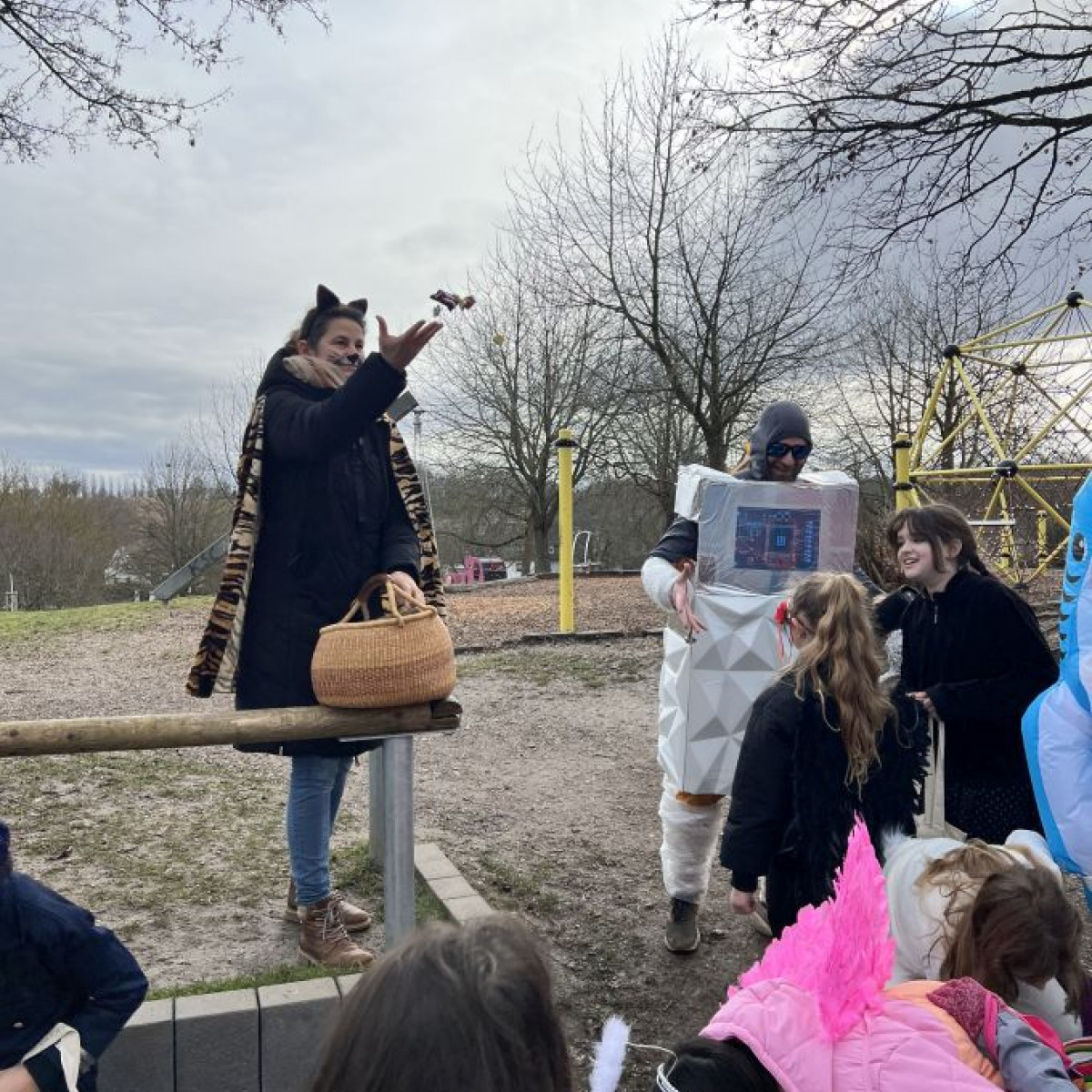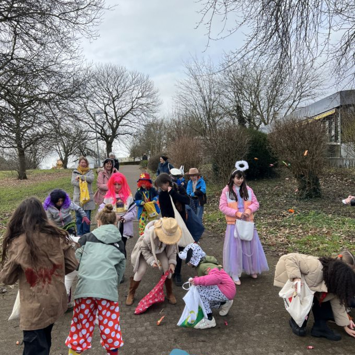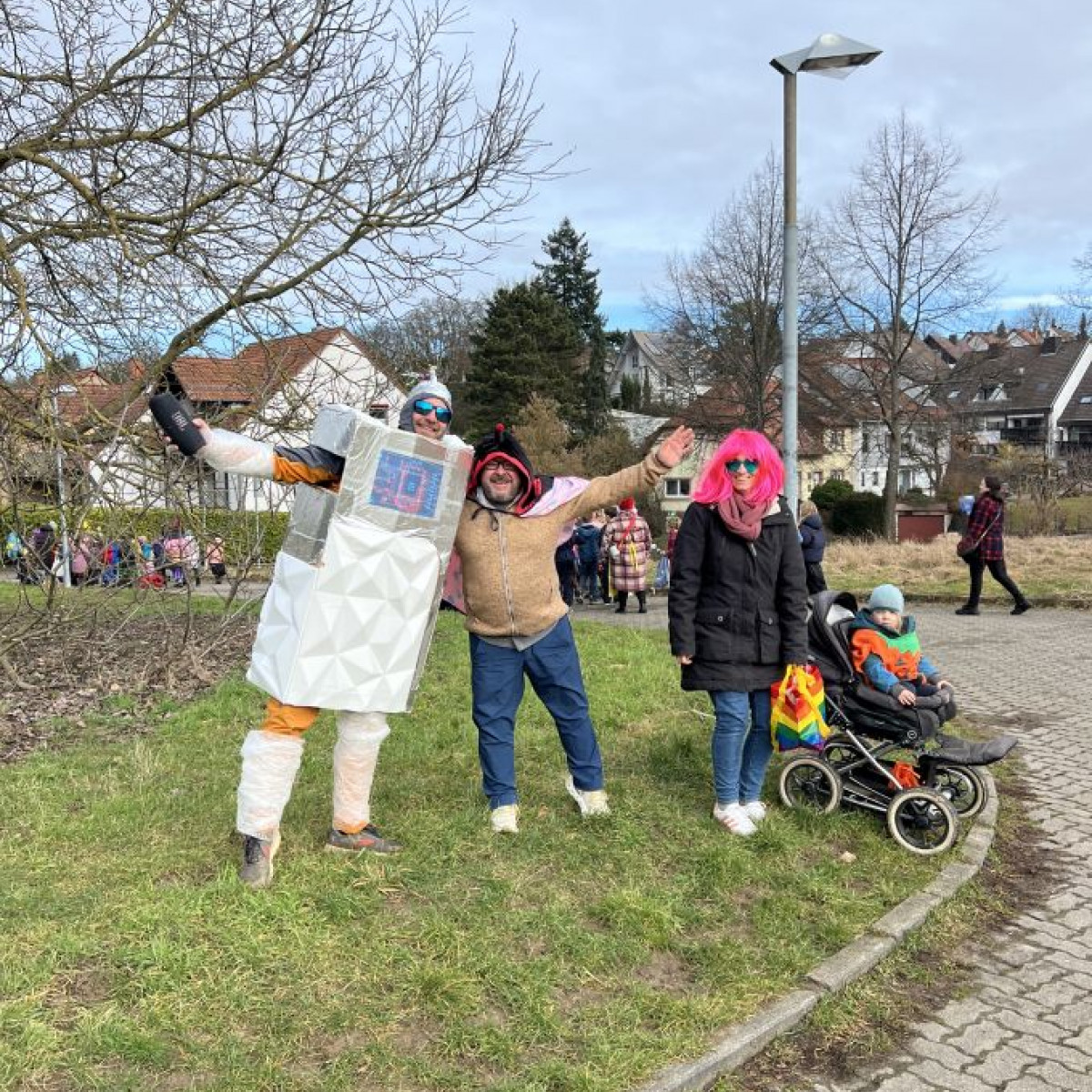 Alle Schülerinnen und Schüler feierten gemeinsam mit ihren Lehrerinnen in den Klassenräumen, bevor eine lange "Gute Laune"- Polonaise durch das Schulhaus zog. In der großen Pause wuchs die Vorfreude spürbar – und dann war es endlich so weit: Die Narren eroberten das Rathaus und der Fastnachtsumzug setzte sich in Bewegung.