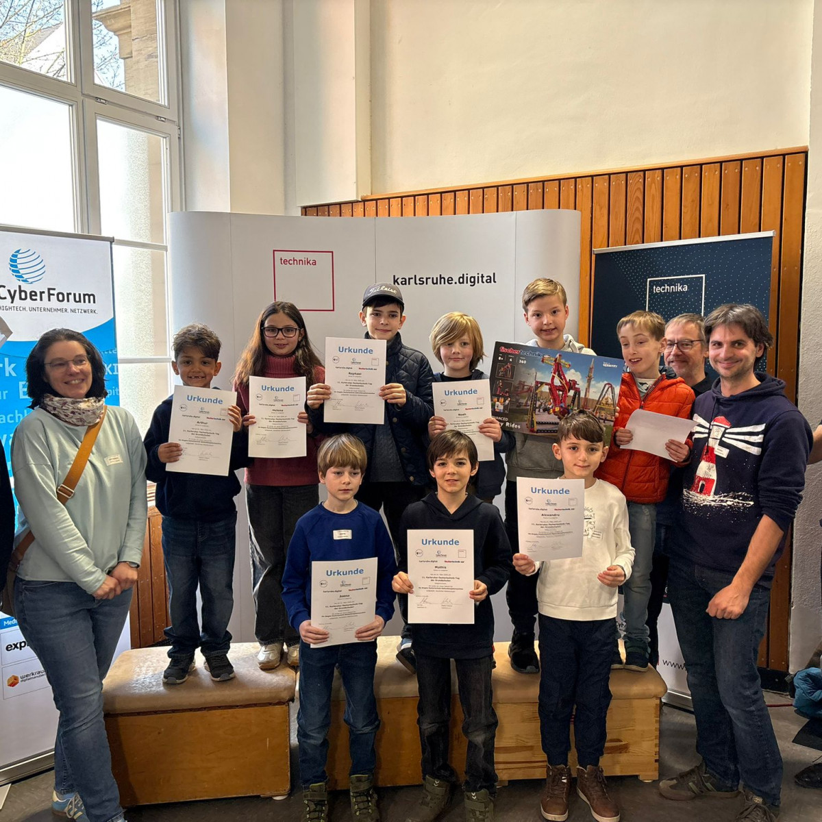 Unsere Schülerinnen und Schüler der Fischertechnik-AG haben am 21. März 2026 gemeinsam mit neun weiteren Fischertechnik-AGs von Karlsruher Grundschulen erneut einen Weltrekord aufgestellt: die längste Tischtennisballweitergabemaschine Deutschlands aus Fischertechnik mit einer Länge von 102,68 Metern!