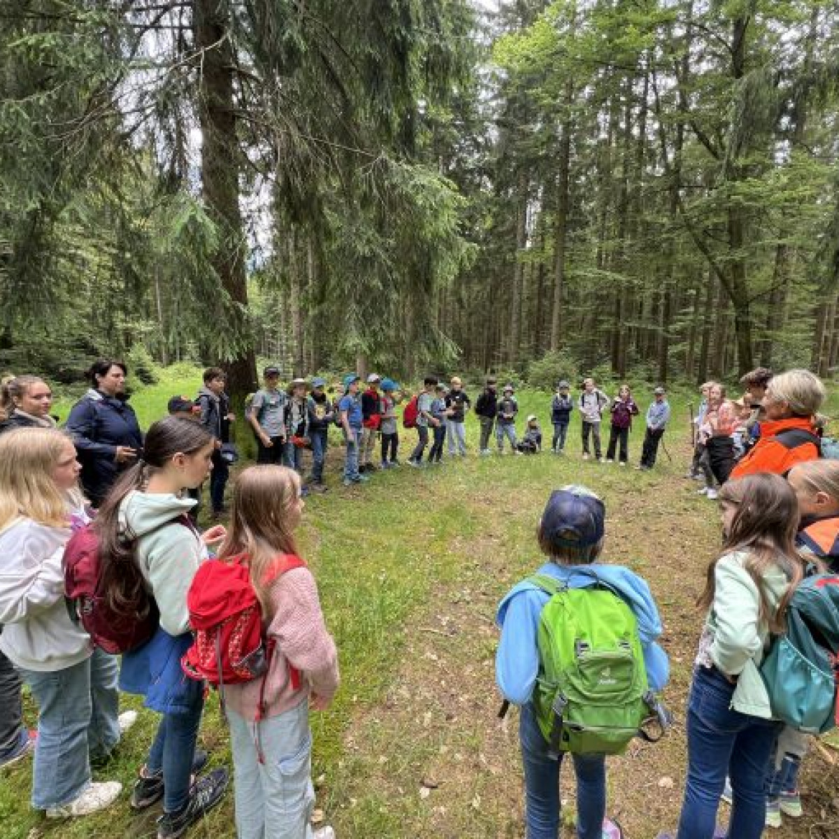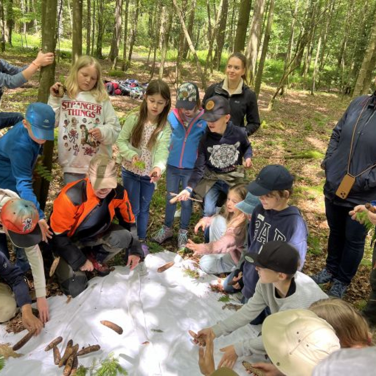 Am Donnerstag, den 13. Juni um 13-16 Uhr machten wir eine Waldaktion mit der netten Försterin Frau Dürr. Dafür trafen wir uns um 10 Minuten vor 13 Uhr im Gruppenraum. Dort besprachen wir noch ein paar Sachen. Als wir dann auf dem Vorplatz des EC-Freizeitheims angekommen waren, wartete Frau Dürr schon auf uns. Zuerst gingen wir auf befestigten, einigermaßen geraden Wegen, bevor wir dann in den Wald gingen. Im Wald stellten wir uns auf einer großen Lichtung im Kreis auf. Die Försterin fragte uns, ob wir schon mal im Wald waren und was uns am Wald gut gefallen hat. Sehr viele sagten, dass sie die Ruhe toll finden, und dass es so grün sei im Wald. Als wir weiter gingen, liefen wir einfach quer durch den Wald, nach dem Motto „Quer Feld ein, ist immer fein.“ Über Wurzeln, Stock und Stein und leere Bierflaschen gelangten wir zu einer kleinen Lichtung, wo wir für die nächste Aktion unsere Rucksäcke zurückließen. Es ging los: wir sollten Gegenstände, die nicht in den Wald gehören finden. Wir trafen uns auf der Lichtung an einem auf dem Waldboden ausgelegtem, weißen Tuch. Zusammen spielten wir das altbekannte Spiel (Wald -)Memory. Natürlich hatten wir lange nicht alle Gegenstände entdeckt, die Frau Dürr zuvor für uns versteckt hatte. Als wir das geschafft hatten, bekamen wir etwas Süßes zu essen, als Power für den ultimativen Endgegner... Das Sägen! Jedes Kind durfte sich mit einer Handsäge eine eigene Baumscheibe absägen. Das machte sehr viel Spaß! Auf dem Heimweg sammelten wir noch die Farben des Waldes und der Wiese, indem wir Blumen und Blätter auf eine Papppalette klebten. Danach gab es wieder freie Zeit, später noch Lagerfeuer mit Stockbrot mit Nutella. Davor gab es noch Eis, wie lecker. (Finley)