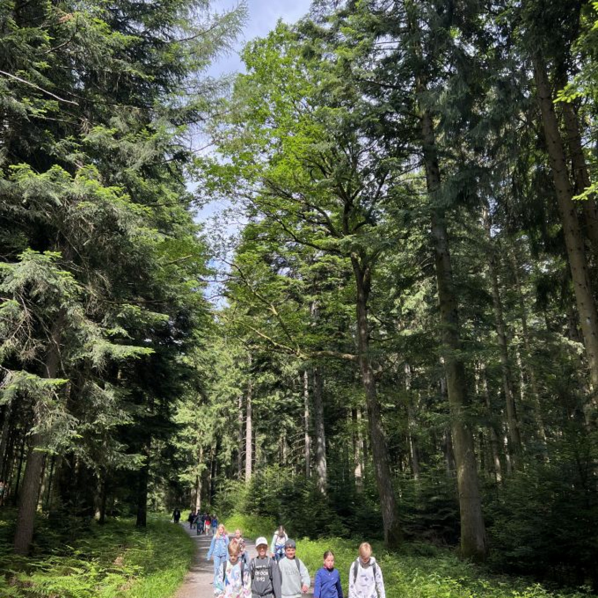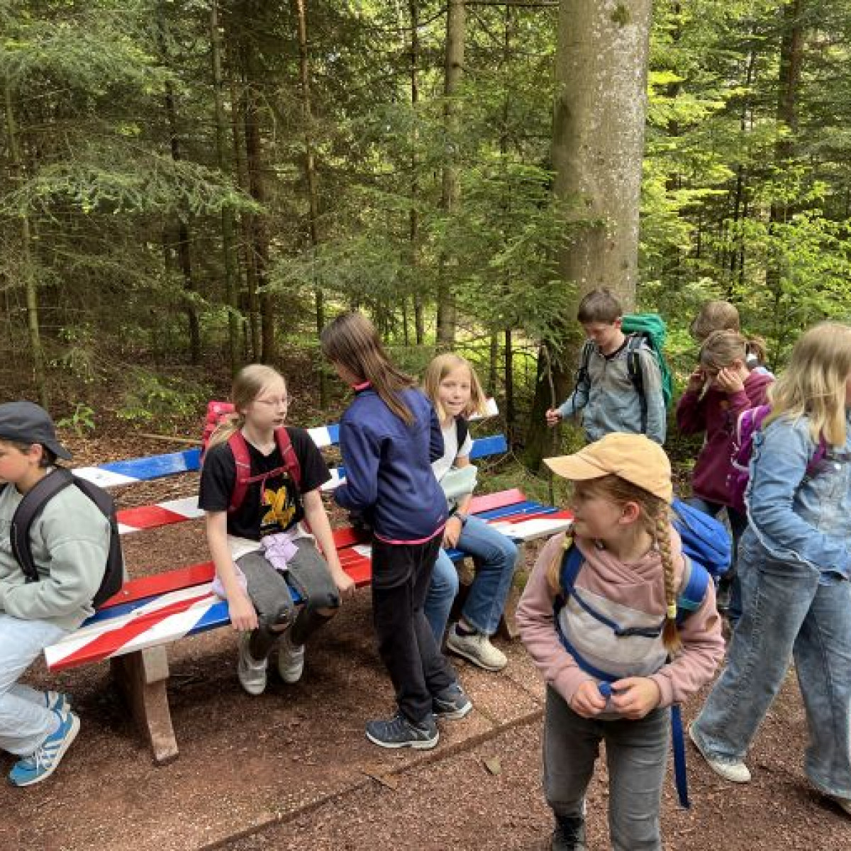 Am Mittwoch, den 12. Juni 2024 sich die Klassen 4a und 4b mit Frau Fuchs, Frau Hambsch, Frau Krauss und Jule Hambsch um 8.45 Uhr auf dem Schulhof. Alle waren aufgeregt! Doch leider hatte der Bus Verspätung. Wir sollten eigentlich um 9 Uhr losfahren, doch er kam erst um 9.10 Uhr. Schnell luden wir alles ein, stiegen in den Bus und dann ging es los. Die Fahrt dauerte etwa eine Stunde. Als wir auf dem Dobel im Freizeitheim ankamen, machten wir erst einmal eine Haus-Rallye. Dabei musste man viele Fragen beantworten und Sachen suchen, wie zum Beispiel einen Beamer neben dem Eingangsbereich. Danach ging es um 12:00 Uhr zum Mittagessen, es gab Chicken-Nuggets mit Pommes. Sehr lecker! Nach dem Mittagessen hatten wir bis 14:00 Uhr freie Zeit. Anschließend sollten wir unsere Zimmer bekommen, doch sie waren noch nicht fertig gereinigt. In dieser Zeit malten wir Schilder für unsere Zimmer. Gegen 15:15 Uhr durften wir endlich unsere Zimmer beziehen. Dort bezogen wir die Betten und packten unsere Sachen aus. (Elias, Jakob, Konsti)