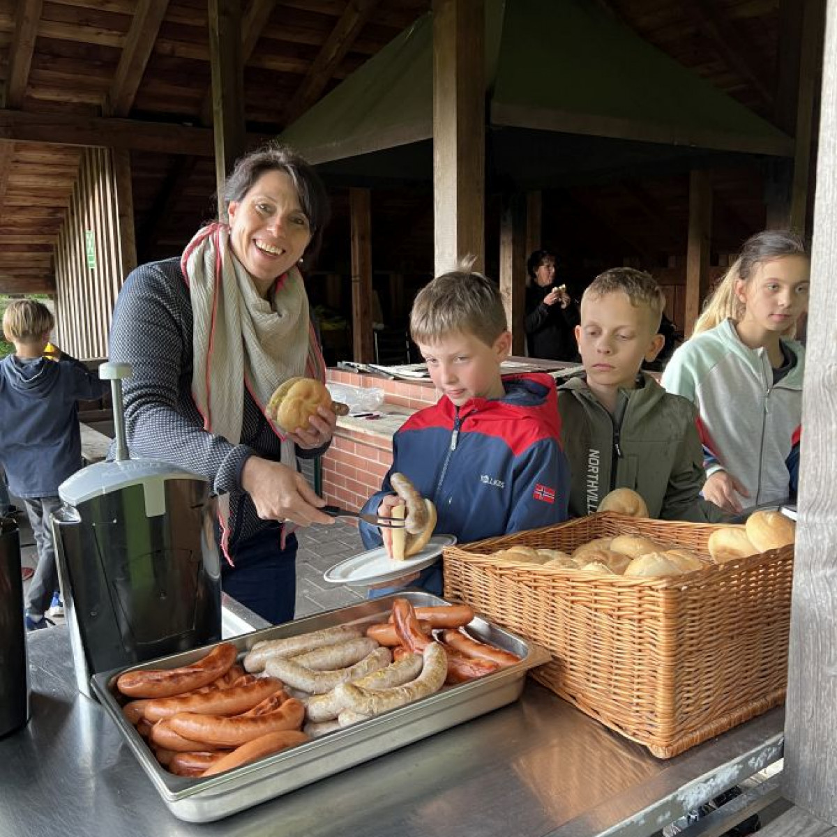 Nachdem wir unsere Zimmer bezogen hatten, gingen wir direkt auf Wanderung. Wir marschierten den Europawanderweg entlang. Dort standen Bänke, die gestrichen waren wie Flaggen von europäischen Ländern. An jeder Bank machte Frau Fuchs ein Foto von uns. Wer das Land richtig erraten hatte, bekam einen Doppelkeks. Zum Schluss hatten alle einen Keks! Als wir wieder am Freizeitheim angekommen waren, hatten wir etwas freie Zeit und gingen anschließend zum Grillen. Es gab Würstchen mit Gemüse und Brötchen. Im Anschluss konnten wir wieder gemeinsam spielen. Um 21:00 Uhr machten wir mit Frau Hambsch, Jule und einem FSJler eine Nachtwanderung mit Taschenlampen auf das Feld. Da nicht mehr alle wandern wollten, konnte andere auch im Aufenthaltsraum bei Frau Krauss und Frau Fuchs häkeln lernen. Gegen 22:30 Uhr mussten wir alle ins Bett, aber wir konnten uns noch etwas unterhalten. Gegen 23:00 Uhr war Bettruhe. Es war ein toller Tag! (Max)