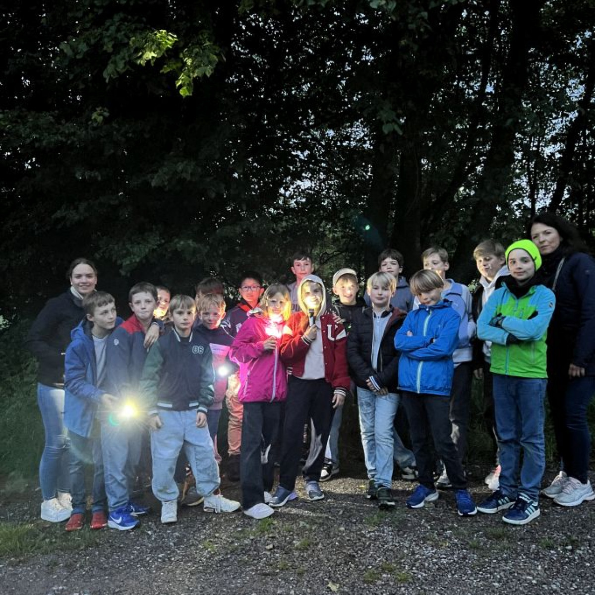 Um 15:30 sind wir dann den Europaweg gelaufen. Das hat sehr viel Spaß gemacht, weil jede 400 Meter eine Bank in den Farben eines EU-Mitgliedes kam. Immer wenn man das Land, das als nächstes kam, richtig getippt hatet, bekam man einen Keks. Natürlich haben am Ende alle einen Keks bekommen. Als wir wieder am Landschulheim angekommen waren, hatten wir freie Zeit. Jeder hat was anderes gemacht. Ein paar Kinder waren Fußball oder Tischtennis spielen, es waren aber auch welche in der Turnhalle tanzen oder auf dem Spielplatz. Abends haben die Lehrerinnen draußen für uns gegrillt. Es gab Wurst im Brötchen, Salat und Schafskäse. Danach konnte man sich für eine Nachtwanderung mit Valerie, Frau Hambsch und Jule oder Häkeln mit Frau Krauss und Frau Fuchs entscheiden. Die meisten haben sich für die Nachtwanderung entschieden. Die war auch sehr schön. Leider war es nicht dunkel, das war aber auch das Einzige, das nicht so gut war. Danach sind wir todmüde ins Bett gefallen. (Janosch)