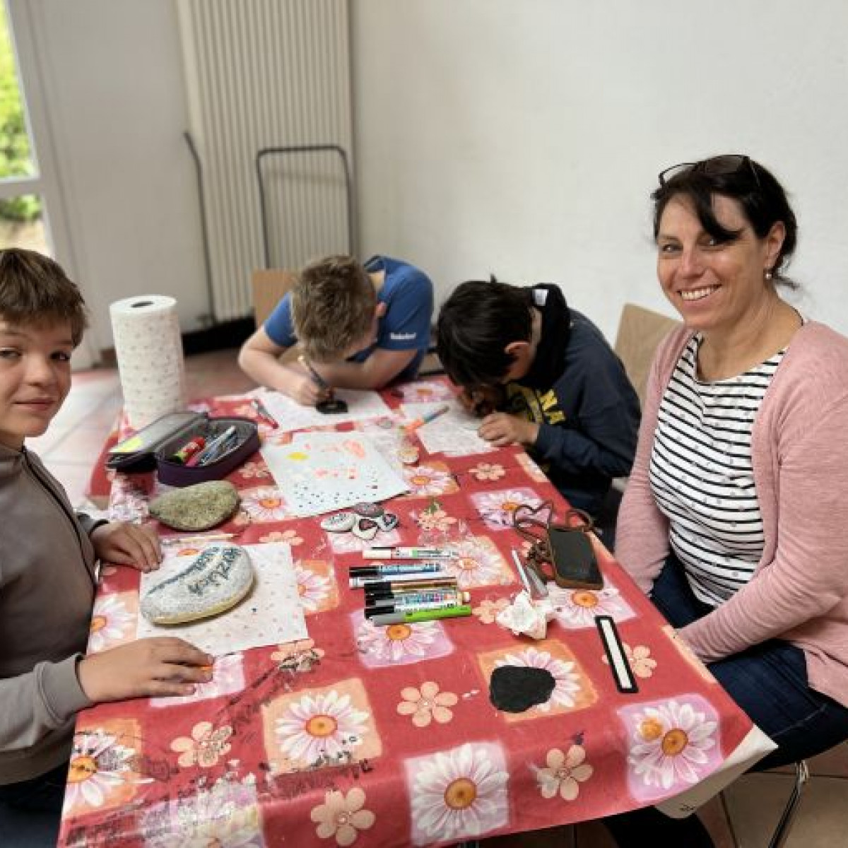 Als unser Küchendienst fertig war, haben wir ein Bonbon bekommen. Danach haben wir uns alle zusammen in einen Kreis hingesetzt und ein EM-Heftchen bekommen. Natürlich haben wir alle sofort begeistert darin gearbeitet, denn wir fieberten schon alle dem Eröffnungsspiel der EM 2024 am heutigen Abend entgegen.