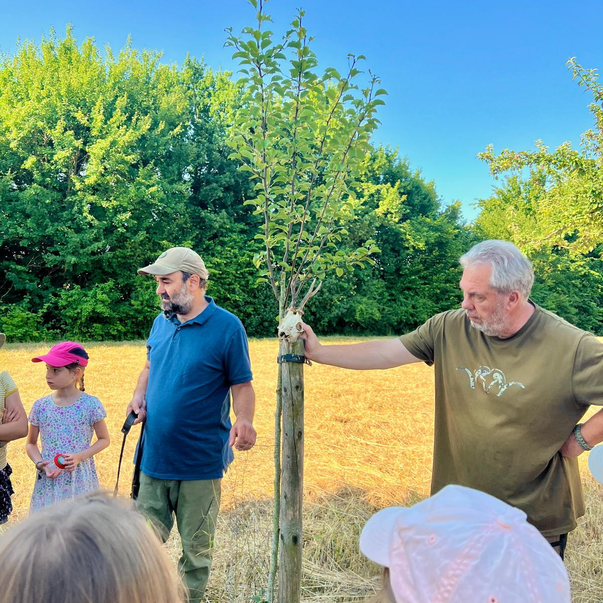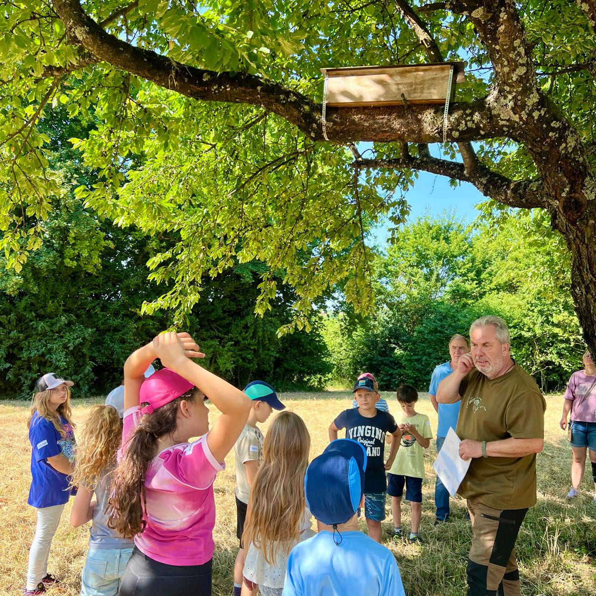 Dort warteten schon Ines, Rolf und Roman vom Liegenschaftsamt auf die Kinder. Sie haben der Klasse ganz viel Spannendes und Neues gezeigt. Die Kinder erfuhren zum Beispiel, was ein Ökosystem ist – also wie Tiere und Pflanzen auf der Streuobstwiese zusammenleben und sich gegenseitig brauchen.