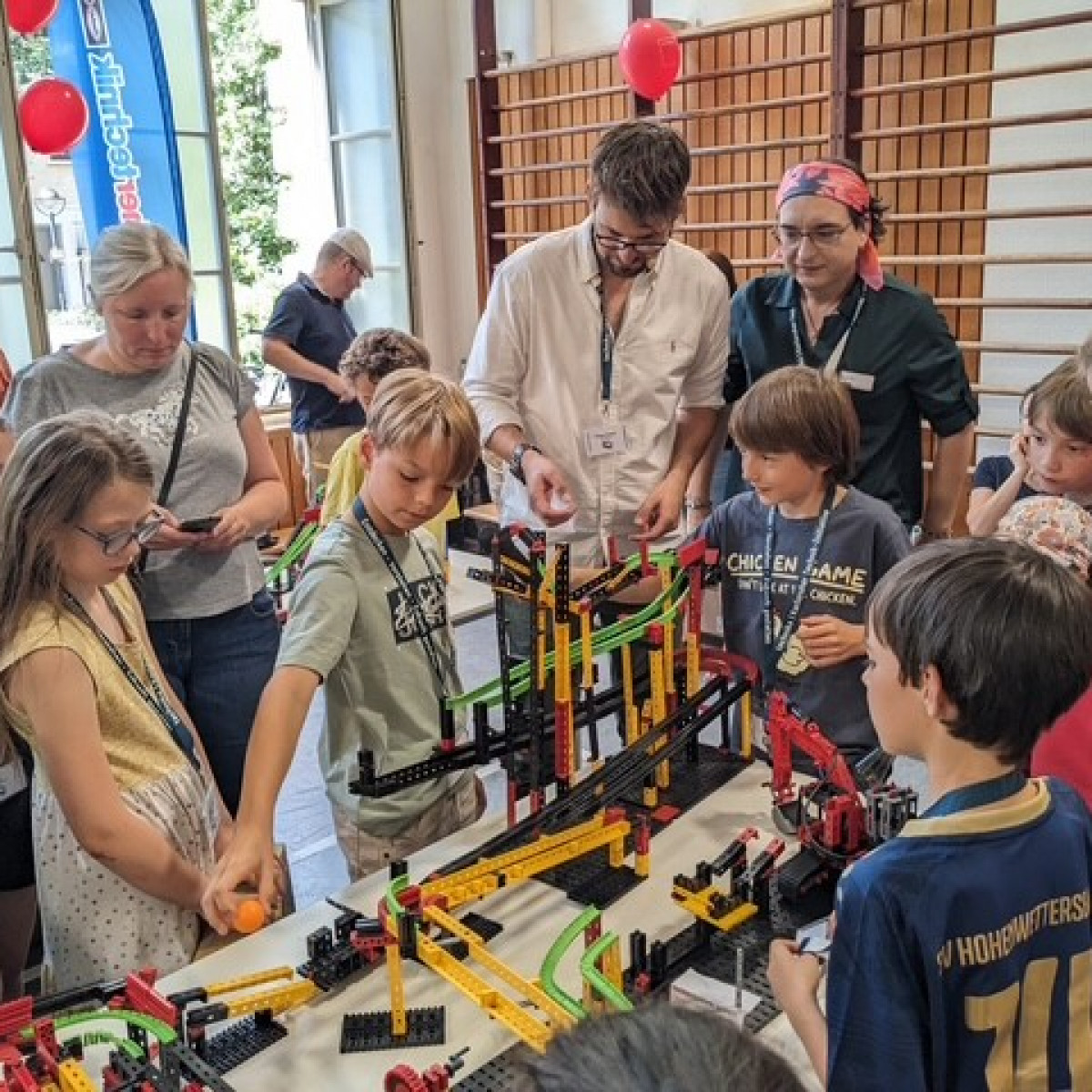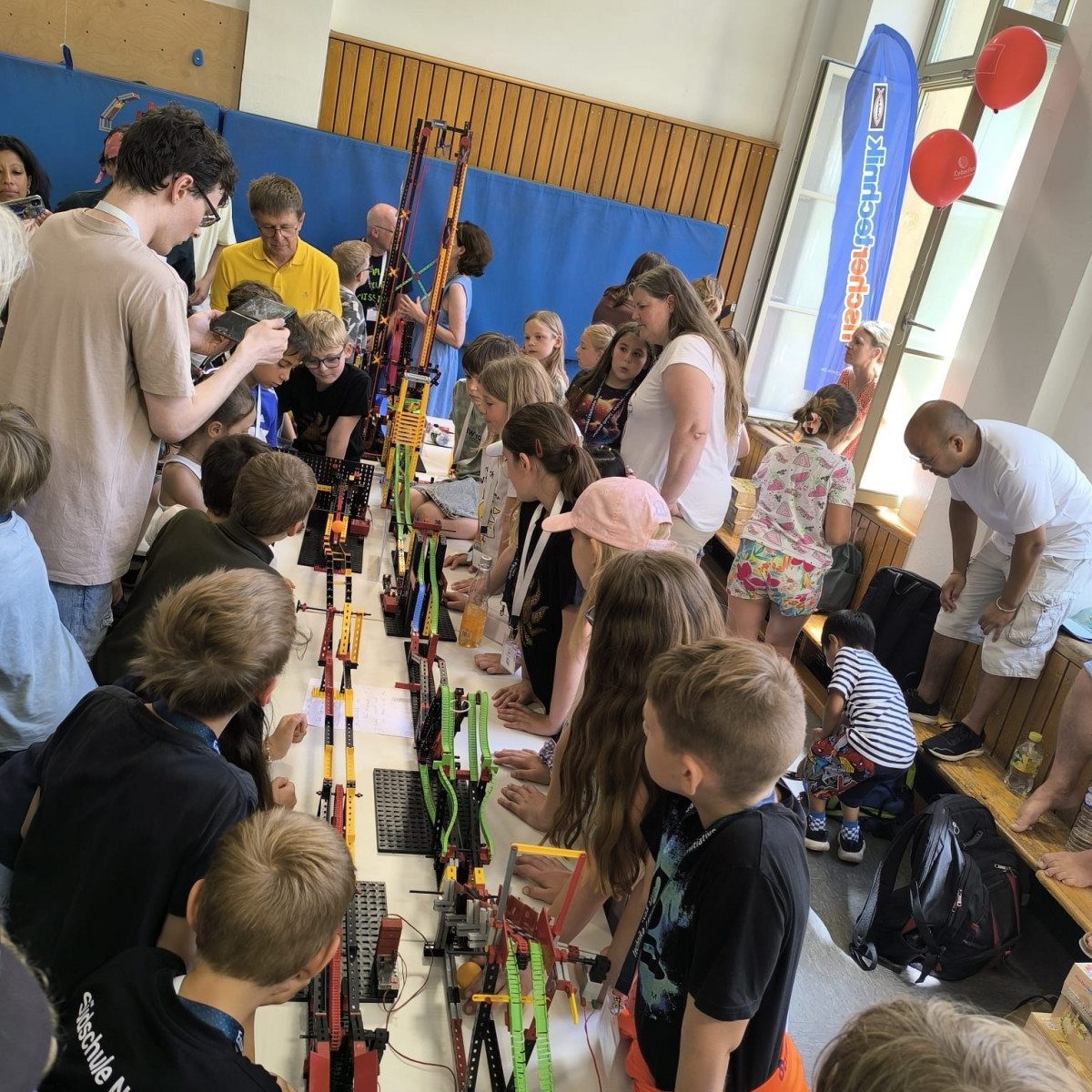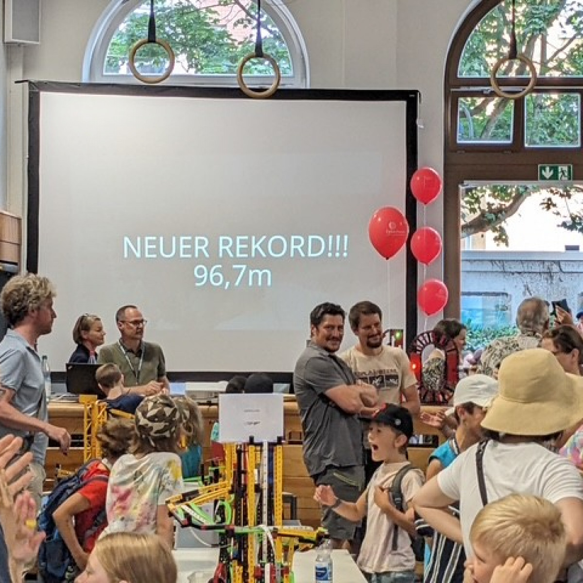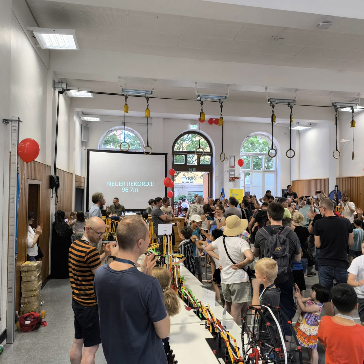 Junge Tüftlerinnen und Tüftler unserer Schule haben Großes geschafft: Am 28. Juni 2025 wurde eine neue Bestmarke aufgestellt – die längste Tischtennisballweitergabemaschine Deutschlands aus Fischertechnik misst nun beeindruckende 96,70 Meter!